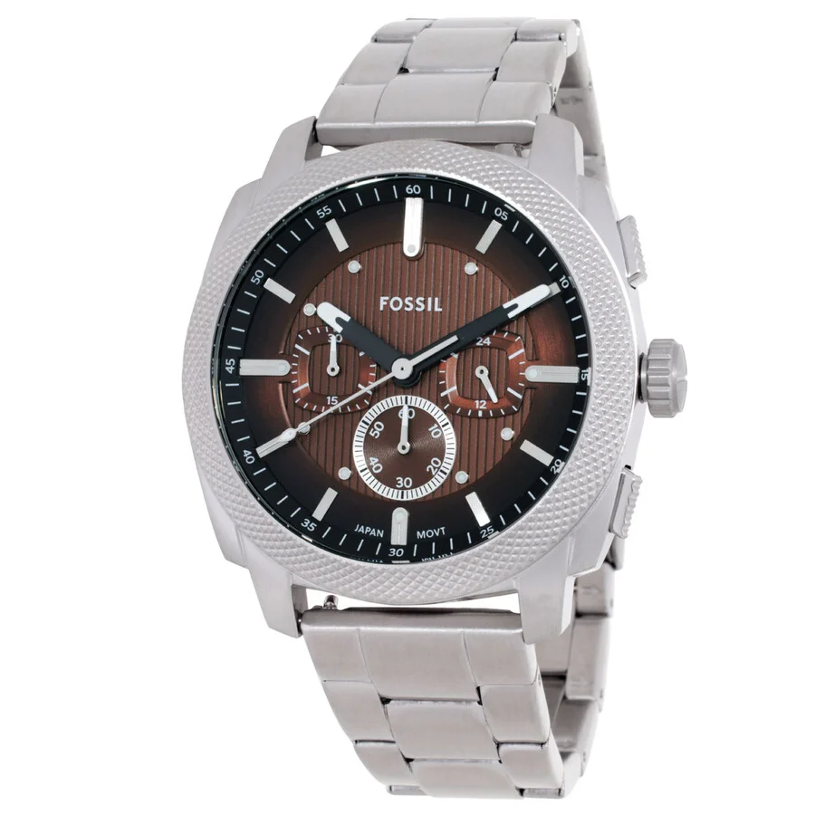 Silver-tone stainless steel case and bracelet. Fixed silver-tone stainless steel bezel. Brown dial with black hands and index hour markers. Minute markers around the outer rim. Dial Type: Analog. Luminescent hands and markers. Quartz movement. Scratch resistant mineral crystal. Pull / push crown. Solid case back. Round case shape, case size: 44 mm. Band width: 22 mm. Deployment with push button release clasp. Water resistant at 50 meters / 165 feet. Functions: chronograph, hour, minute, second. Machine Series. Watch label: Japan Movt. Fossil Machine Chronograph Quartz Brown Dial Men's Watch FS6144. GENERAL Box Type: Original Box CASE Case Diameter: 44 mm Case Material: Stainless Steel Case Shape: Round Case Back: Solid BAND Band Material: Stainless Steel Band Type: Bracelet Band Color: Silver-tone Band Width: 22 mm Clasp: Deployment with Push Button Release DIAL Dial Color: Brown Type: Analog Crystal: Scratch Resistant Mineral Hands: Black Dial Markers: Index Second Markers: Minute Markers around the outer rim Luminiscence: Hands and Markers Bezel: Fixed Bezel Color: Silver-tone Bezel Material: Stainless Steel Crown: Pull / Push INFORMATION Brand: Fossil Series: Machine Collection Name: Machine Gender: Mens Model: FS6144 Watch Label: Japan Movt Movement: Quartz FEATURES Water Resistance: 50 meters / 165 feet Functions: Chronograph, Hour, Minute, Second Watch Features: Chronograph, Stainless Steel, Analog ADDITIONAL INFO Warranty: 2 Year Jomashop Warranty UPC Code: 4064092366556 Jomashop Sku: FSFS6144 Department: Watches