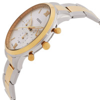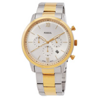 Silver-tone stainless steel case and bracelet. Fixed gold-tone stainless steel bezel. Silver-tone dial with gold-tone hands and index-Roman numeral hour markers. Minute markers around the outer rim. Dial Type: Analog. Date display between 4 and 5 o'clock position. Chronograph - three sub-dials displaying: 60 second, 30 minute and 24 hours. Quartz movement. Scratch resistant mineral crystal. Pull / push crown. Solid case back. Round case shape, case size: 44 mm. Band width: 22 mm. Deployment with push button release clasp. Water resistant at 50 meters / 165 feet. Functions: chronograph, date, hour, minute, second. Neutra Series. Dress watch style. Watch label: Japan Movt. Fossil Neutra Chronograph Quartz Silver Dial Men's Watch FS6112. GENERAL Box Type: Original Box CASE Case Material: Stainless Steel Case Shape: Round Case Back: Solid BAND Band Material: Stainless Steel Band Type: Bracelet Band Color: Silver-tone Band Width: 22 mm Clasp: Deployment with Push Button Release DIAL Dial Color: Silver-tone Type: Analog Crystal: Scratch Resistant Mineral Hands: Gold-tone Dial Markers: Index-Roman Numeral Second Markers: Minute Markers around the outer rim Sub Dials: Three - 60 Second, 30 Minute and 24 Hours Bezel: Fixed Bezel Color: Gold-tone Bezel Material: Stainless Steel Crown: Pull / Push INFORMATION Brand: Fossil Series: Neutra Collection Name: Neutra Gender: Mens Model: FS6112 Watch Label: Japan Movt Movement: Quartz FEATURES Water Resistance: 50 meters / 165 feet Calendar: Date display between 4 and 5 o'clock position Functions: Chronograph, Date, Hour, Minute, Second Watch Features: Analog, Gold, Stainless Steel, Chronograph ADDITIONAL INFO Watch Style: Dress Warranty: 2 Year Jomashop Warranty UPC Code: 796483676398 Jomashop Sku: FSFS6112 Department: Watches