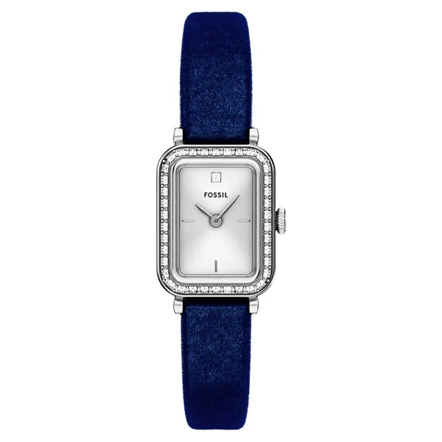 Silver-tone stainless steel case with a blue leather strap. Fixed silver-tone stainless steel bezel. White dial with silver-tone hands and index hour markers. Dial Type: Analog. Quartz movement. Scratch resistant mineral crystal. Solid case back. Rectangle case shape, case size: 18 mm. Band width: 10 mm, band length: 7.5 inches. Buckle clasp. Functions: hour, minute. Raquel Series. Fashion watch style. Fossil Raquel Quartz White Dial Ladies Watch ES5436. GENERAL Box Type: Original Box CASE Case Material: Stainless Steel Case Shape: Rectangle Case Back: Solid BAND Band Material: Leather Band Type: Strap Band Color: Blue Band Length: 7.5 inches Band Width: 10 mm Clasp: Buckle DIAL Dial Color: White Type: Analog Crystal: Scratch Resistant Mineral Hands: Silver-tone Dial Markers: Index Bezel: Fixed Bezel Color: Silver-tone Bezel Material: Stainless Steel INFORMATION Brand: Fossil Series: Raquel Collection Name: Raquel Gender: Womens Model: ES5436 Movement: Quartz FEATURES Functions: Hour, Minute Watch Features: Analog, Leather, Stainless Steel ADDITIONAL INFO Watch Style: Fashion Warranty: 2 Year Jomashop Warranty UPC Code: 4064092366198 Jomashop Sku: FSES5436 Department: Watches