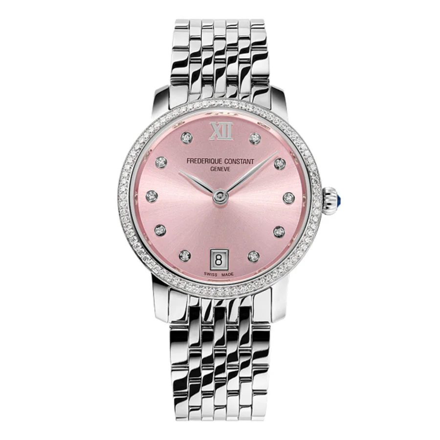 Silver-tone stainless steel case and bracelet. Fixed silver-tone bezel with diamond set stainless steel. Pink dial with silver-tone hands and diamond hour markers. Dial Type: Analog. Date display at the 6 o'clock position. Frederique Constant Calibre FC-220 quartz movement. Scratch resistant sapphire crystal. Solid case back. Round case shape, case size: 30 mm. Fold over clasp with a safety release. Functions: date, hour, minute. Classics Slimline Series. Luxury watch style. Watch label: Swiss Made. Frederique Constant Classics Slimline Quartz Diamond Pink Dial Ladies Watch FC-220LPD1SD26B. GENERAL Box Type: Original Box CASE Case Material: Stainless Steel Case Shape: Round Case Back: Solid BAND Band Material: Stainless Steel Band Type: Bracelet Band Color: Silver-tone Clasp: Fold Over with Safety Release DIAL Dial Color: Pink Type: Analog Crystal: Scratch Resistant Sapphire Hands: Silver-tone Dial Markers: Diamond Bezel: Fixed Bezel Color: Silver-tone Bezel Material: Diamond Set Stainless Steel INFORMATION Brand: Frederique Constant Series: Classics Slimline Collection Name: Classics Slimline Gender: Womens Model: FC-220LPD1SD26B Watch Label: Swiss Made Movement: Quartz Engine: Frederique Constant Calibre FC-220 FEATURES Calendar: Date display at the 6 o'clock position Functions: Date, Hour, Minute Watch Features: Analog, Stainless Steel, Diamond ADDITIONAL INFO Watch Style: Luxury Warranty: 2 Year Jomashop Warranty Jomashop Sku: FC220LPD1SD26B Department: Watches