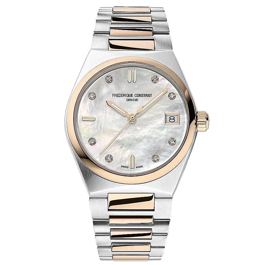 Silver-tone stainless steel case with a two-tone (silver-tone and rose gold-tone) stainless steel bracelet. Fixed rose gold-tone stainless steel bezel. White mother of pearl dial with rose gold-tone hands and index-diamond hour markers. 8 diamond indexes (0. 04 carat). Dial Type: Analog. Date display at the 3 o'clock position. Frederique Constant Calibre FC-240 quartz movement. Scratch resistant sapphire crystal. Pull / push crown. Solid case back. Round case shape, case size: 31 mm. Water resistant at 50 meters / 165 feet. Functions: date, hour, minute, second. Highlife Series. Dress watch style. Watch label: Swiss Made. Frederique Constant Highlife Quartz Diamond Ladies Watch FC-240MPWD2NH22B. GENERAL Box Type: Original Box CASE Case Thickness: 8.3 mm Case Material: Stainless Steel Case Shape: Round Case Back: Solid BAND Band Material: Stainless Steel Band Type: Bracelet Band Color: Two-tone (Silver-tone and Rose Gold-tone) Band Width: 16 mm DIAL Dial Color: White Mother of Pearl Type: Analog Crystal: Scratch Resistant Sapphire Hands: Rose Gold-tone Dial Markers: Index-Diamond Second Markers: 8 diamond Indexes (0.04 carat) Bezel: Fixed Bezel Color: Rose Gold-tone Bezel Material: Stainless Steel Crown: Pull / Push INFORMATION Brand: Frederique Constant Series: Highlife Collection Name: Highlife Gender: Womens Model: FC-240MPWD2NH22B Watch Label: Swiss Made Movement: Quartz Engine: Frederique Constant Calibre FC-240 FEATURES Water Resistance: 50 meters / 165 feet Calendar: Date display at the 3 o'clock position Functions: Date, Hour, Minute, Second Watch Features: Analog, Gold, Stainless Steel, Diamond ADDITIONAL INFO Watch Style: Dress Warranty: 2 Year Jomashop Warranty Jomashop Sku: FC-240MPWD2NH22B Department: Watches
