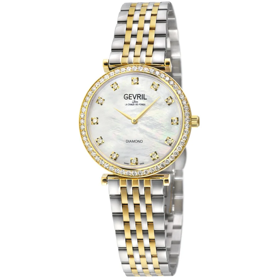 Silver-tone stainless steel case with a two-tone (silver-tone and yellow gold-tone) stainless steel bracelet. Fixed yellow gold-tone stainless steel bezel. Mother of pearl dial with yellow gold-tone hands and index hour markers. Dial Type: Analog. Ronda Caliber 1062 quartz movement. Scratch resistant sapphire crystal. Pull / push crown. Solid case back. Round case shape, case size: 32 mm, case thickness: 5.2 mm. Band width: 14 mm. Deployment with push button release clasp. Water resistant at 30 meters / 100 feet. Functions: hour, minute. Additional Info: diamonds. Atelier 57 Series. Luxury watch style. Watch label: Swiss Made. Gevril Atelier 57 Mother of Pearl Dial Ladies Watch 15231BD. GENERAL Box Type: Original Box CASE Case Thickness: 5.2 mm Case Material: Stainless Steel Case Shape: Round Case Back: Solid BAND Band Material: Stainless Steel Band Type: Bracelet Band Color: Two-tone (Silver-tone and Yellow Gold-tone) Band Width: 14 mm Clasp: Deployment with Push Button Release DIAL Dial Color: Mother of Pearl Type: Analog Crystal: Scratch Resistant Sapphire Hands: Yellow Gold-tone Dial Markers: Index Bezel: Fixed Bezel Color: Yellow Gold-tone Bezel Material: Stainless Steel Crown: Pull / Push INFORMATION Brand: Gevril Series: Atelier 57 Collection Name: Atelier 57 Gender: Womens Model: 15231BD Watch Label: Swiss Made Movement: Quartz Engine: Ronda Caliber 1062 FEATURES Water Resistance: 30 meters / 100 feet Functions: Hour, Minute Watch Features: Analog, Gold, Stainless Steel, Diamond ADDITIONAL INFO Watch Style: Luxury Warranty: With Manufacturers Guarantee UPC Code: 840840151100 Additional Info: Diamonds Jomashop Sku: Y-A5VW4 Department: Watches