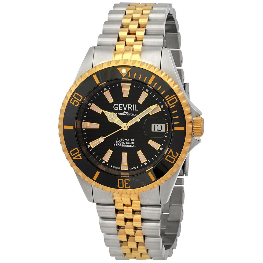 Stainless steel case with a two-tone (silver-tone and yellow gold-tone) stainless steel bracelet. Uni-directional rotating gold-tone bezel with an inlaid black ring. Black dial with luminous yellow gold-tone hands and index hour markers. Minute markers around the outer rim. Dial Type: Analog. Luminescent hands and markers. Date display at the 3 o'clock position. Sellita caliber SW200 automatic movement, containing 26 Jewels, bitting at 28800 vph, and has a power reserve of approximately 38 hours. Scratch resistant sapphire crystal. Screw down crown. Transparent case back. Round case shape. Case size: 43 mm. Case thickness: 13 mm. Band width: 18 mm. Deployment clasp with a push button release. Water resistant at 200 meters / 660 feet. Functions: date, hour, minute, second. Additional Info: magnified date window, ceramic bezel. Chambers Series. Luxury watch style. Watch label: Swiss Made. Gevril Chambers Automatic Black Dial Men's Watch 42602. INFORMATION Brand: Gevril Series: Chambers Collection Name: Chambers Gender: Mens Model: 42602 Watch Label: Swiss Made Movement: Automatic Engine: Sellita Caliber SW200 Power Reserve: 38 hours CASE Case Size: 43 mm Case Thickness: 13 mm Case Material: Stainless Steel Case Shape: Round Case Back: Transparent BAND Band Material: Stainless Steel Band Type: Bracelet Band Color: Two-tone (Silver-tone and Yellow Gold-tone) Band Width: 18 mm Clasp: Deployment with Push Button Release DIAL Dial Color: Black Type: Analog Crystal: Scratch Resistant Sapphire Hands: Luminous Yellow Gold-tone Dial Markers: Index Second Markers: Minute Markers around the outer rim Luminiscence: Hands and Markers Bezel: Uni-directional Rotating Bezel Color: Gold-tone Bezel Material: Stainless Steel with an inlaid Black Ring Crown: Screw Down FEATURES Water Resistance: 200 meters / 660 feet Calendar: Date display at the 3 o'clock position Functions: Date, Hour, Minute, Second Watch Features: Stainless Steel, Gold, Ceramic, Analog ADDITIONAL INFO Watch Style: Luxury Warranty: With Manufacturers Guarantee UPC Code: 840840128102 Additional Info: magnified date window, Ceramic bezel Jomashop Sku: Y-165726 Department: Watches Category: Watches