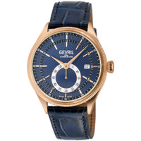 Rose gold-tone stainless steel case with a blue leather strap. Fixed rose gold-tone stainless steel bezel. Blue dial with rose gold-tone hands and index hour markers. Minute markers around the outer rim. Dial Type: Analog. Date display at the 3 o'clock position. One subdial displaying: small second. ETA Caliber 2895-2 Automatic movement, based upon ETA 2892-A2, containing 27 Jewels, bitting at 28800 vph, and has a power reserve of approximately 42 hours. Scratch resistant sapphire crystal. Screw down crown. Transparent case back. Round case shape, case size: 40 mm, case thickness: 10 mm. Band width: 20 mm. Buckle clasp. Water resistant at 100 meters / 330 feet. Functions: date, hour, minute, small second. Additional Info: seconds subdial. Empire Series. Luxury watch style. Watch label: Swiss Made. Gevril Empire Automatic Blue Dial Men's Watch 48104. GENERAL Box Type: Original Box CASE Case Size: 40 Case Thickness: 10 mm Case Material: Stainless Steel Case Shape: Round Case Back: Transparent BAND Band Material: Leather Band Type: Strap Band Color: Blue Band Width: 20 mm Clasp: Buckle DIAL Dial Color: Blue Type: Analog Crystal: Scratch Resistant Sapphire Hands: Rose Gold-tone Dial Markers: Index Second Markers: Minute Markers around the outer rim Sub Dials: One - Small Second Bezel: Fixed Bezel Color: Rose Gold-tone Bezel Material: Stainless Steel Crown: Screw Down INFORMATION Brand: Gevril Series: Empire Collection Name: Empire Gender: Mens Model: 48104 Watch Label: Swiss Made Movement: Automatic Engine: ETA Caliber 2895-2 Power Reserve: 42 hours FEATURES Water Resistance: 100 meters / 330 feet Calendar: Date display at the 3 o'clock position Functions: Date, Hour, Minute, Small Second Watch Features: Analog, Gold, Leather, Stainless Steel ADDITIONAL INFO Watch Style: Luxury Warranty: https://www.gevril.com/pages/watch-repair-shop-and UPC Code: 840840142627 Additional Info: seconds subdial Jomashop Sku: Y-A3CQY Department: Watches Category: Watches