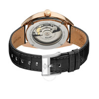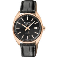 Rose gold-tone stainless steel case with a black genuine leather strap. Fixed rose gold-tone stainless steel bezel. Black dial with rose gold-tone hands and index hour markers. Minute markers around the outer rim. Dial Type: Analog. Luminescent hands and markers. Date display at the 3 o'clock position. Sellita Caliber SW200 Automatic movement, containing 26 Jewels, bitting at 28800 vph, and has a power reserve of approximately 38 hours. Scratch resistant sapphire crystal. Pull / push crown. Transparent case back. Tonneau case shape, case size: 40 mm, case thickness: 11.5 mm. Band width: 18 mm. Buckle clasp. Water resistant at 50 meters / 165 feet. Functions: date, hour, minute, second. Five Points Series. Luxury watch style. Watch label: Swiss Made. Gevril Five Points Automatic Black Dial Men's Watch 48703A. INFORMATION Brand: Gevril Series: Five Points Collection Name: Five Points Gender: Mens Model: 48703A Watch Label: Swiss Made Movement: Automatic Engine: Sellita Caliber SW200 Power Reserve: 38 hours CASE Case Size: 40 mm Case Thickness: 11.5 mm Case Material: Stainless Steel Case Shape: Tonneau Case Back: Transparent BAND Band Material: Genuine Leather Band Type: Strap Band Color: Black Band Width: 18 mm Clasp: Buckle DIAL Dial Color: Black Type: Analog Crystal: Scratch Resistant Sapphire Hands: Rose Gold-tone Dial Markers: Index Second Markers: Minute Markers around the outer rim Luminiscence: Hands and Markers Bezel: Fixed Bezel Color: Rose Gold-tone Bezel Material: Stainless Steel Crown: Pull / Push FEATURES Water Resistance: 50 meters / 165 feet Calendar: Date display at the 3 o'clock position Functions: Date, Hour, Minute, Second Watch Features: Stainless Steel, Leather, Gold, Analog ADDITIONAL INFO Watch Style: Luxury Warranty: With Manufacturers Guarantee UPC Code: 840840129932 Jomashop Sku: Y-170972 Department: Watches Category: Watches