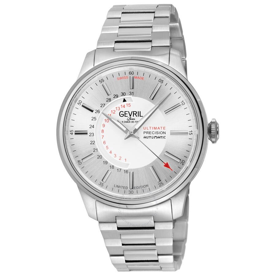 Silver-tone stainless steel case and bracelet. Fixed silver-tone stainless steel bezel. Silver-tone dial with silver-tone hands and index hour markers. Minute markers around the outer rim. Dial Type: Analog. Luminescent hands. Date display between 8 and 11 o'clock position. Sellita SW200-1 automatic movement. Scratch resistant sapphire crystal. Screw down crown. Transparent case back. Round case shape, case size: 44 mm, case thickness: 11 mm. Band width: 18 mm. Deployment with push button release clasp. Water resistant at 50 meters / 165 feet. Functions: date, hour, minute, second. Guggenheim Series. Luxury watch style. Watch label: Swiss Made. Gevril Guggenheim Automatic Silver Dial Men's Watch 49205B. INFORMATION Brand: Gevril Series: Guggenheim Collection Name: Guggenheim Gender: Mens Model: 49205B Watch Label: Swiss Made Movement: Automatic Engine: Sellita SW200-1 CASE Case Size: 44 mm Case Thickness: 11 mm Case Material: Stainless Steel Case Shape: Round Case Back: Transparent BAND Band Material: Stainless Steel Band Type: Bracelet Band Color: Silver-tone Band Width: 18 mm Clasp: Deployment with Push Button Release DIAL Dial Color: Silver-tone Type: Analog Crystal: Scratch Resistant Sapphire Hands: Silver-tone Dial Markers: Index Second Markers: Minute Markers around the outer rim Luminiscence: Hands Bezel: Fixed Bezel Color: Silver-tone Bezel Material: Stainless Steel Crown: Screw Down FEATURES Water Resistance: 50 meters / 165 feet Calendar: Date display between 8 and 11 o'clock position Functions: Date, Hour, Minute, Second Watch Features: Stainless Steel, Analog ADDITIONAL INFO Watch Style: Luxury Warranty: With Manufacturers Guarantee UPC Code: 840840146441 Jomashop Sku: Y-A4HEM Department: Watches