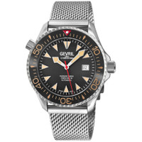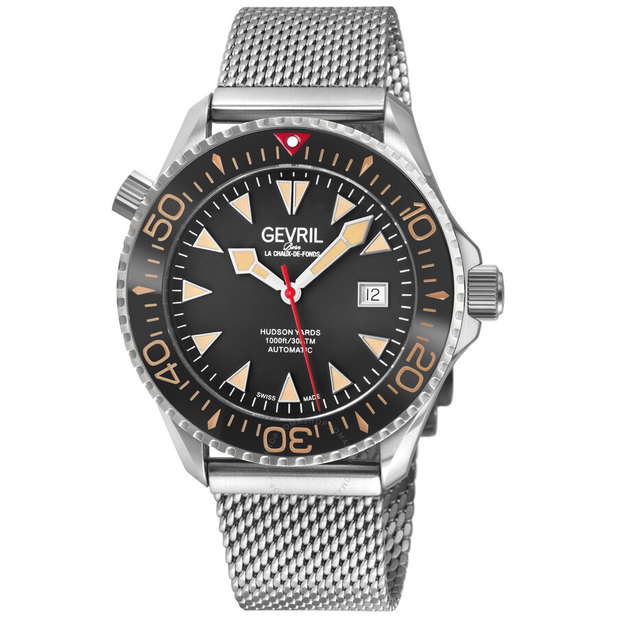 Silver-tone stainless steel case and bracelet. Uni-directional rotating black ceramic bezel. Black dial with silver-tone hands and index hour markers. Minute markers around the outer rim. Dial Type: Analog. Luminescent hands and markers. Date display at the 3 o'clock position. Sellita Caliber SW200-1 Automatic movement, containing 26 Jewels, bitting at 28800 vph, and has a power reserve of approximately 38 hours. Scratch resistant sapphire crystal. Screw down crown. Transparent case back. Round case shape, case size: 43 mm, case thickness: 13 mm. Band width: 20 mm. Deployment with push button release clasp. Water resistant at 300 meters / 1000 feet. Functions: date, hour, minute, second. Hudson Yards Series. Luxury watch style. Watch label: Swiss Made. Gevril Hudson Yards Automatic Black Dial Men's Watch 48840B. INFORMATION Brand: Gevril Series: Hudson Yards Collection Name: Hudson Yards Gender: Mens Model: 48840B Watch Label: Swiss Made Movement: Automatic Engine: Sellita Caliber SW200-1 Power Reserve: 38 hours CASE Case Size: 43 mm Case Thickness: 13 mm Case Material: Stainless Steel Case Shape: Round Case Back: Transparent BAND Band Material: Stainless Steel Band Type: Bracelet Band Color: Silver-tone Band Width: 20 mm Clasp: Deployment with Push Button Release DIAL Dial Color: Black Type: Analog Crystal: Scratch Resistant Sapphire Hands: Silver-tone Dial Markers: Index Second Markers: Minute Markers around the outer rim Luminiscence: Hands and Markers Bezel: Uni-directional Rotating Bezel Color: Black Bezel Material: Ceramic Crown: Screw Down FEATURES Water Resistance: 300 meters / 1000 feet Calendar: Date display at the 3 o'clock position Functions: Date, Hour, Minute, Second Watch Features: Stainless Steel, Ceramic, Analog ADDITIONAL INFO Watch Style: Luxury UPC Code: 840840146144 Jomashop Sku: Y-A4EJ8 Department: Watches Category: Watches