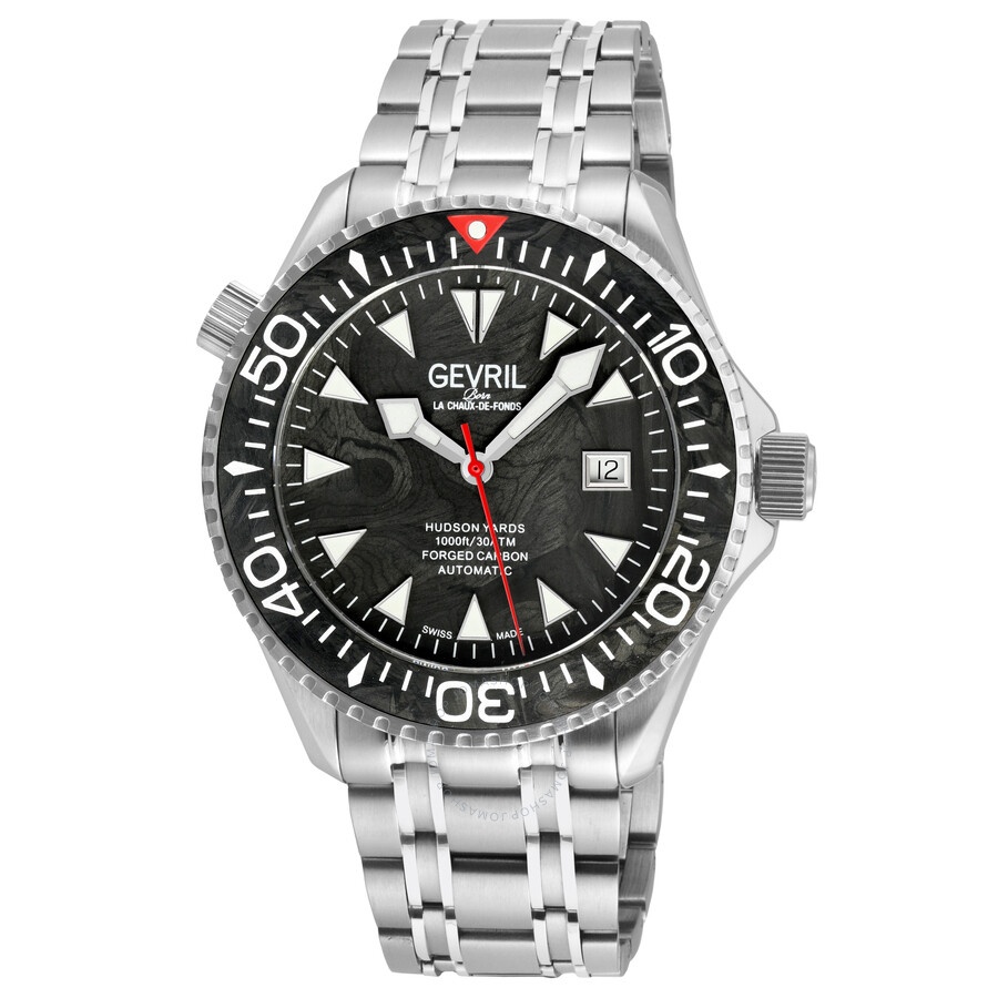 Silver-tone stainless steel case and bracelet. Uni-directional rotating black carbon fiber bezel. Black dial with silver-tone hands and index hour markers. Minute markers around the outer rim. Dial Type: Analog. Luminescent hands and markers. Date display at the 3 o'clock position. Sellita Caliber SW200-1 Automatic movement, containing 26 Jewels, bitting at 28800 vph, and has a power reserve of approximately 38 hours. Scratch resistant sapphire crystal. Screw down crown. Transparent case back. Round case shape, case size: 43 mm, case thickness: 13 mm. Band width: 19 mm. Deployment with push button release clasp. Water resistant at 300 meters / 1000 feet. Functions: date, hour, minute, second. Additional Info: black carbon fiber dial, dive extension deployment buckle. Hudson Yards Series. Luxury watch style. Watch label: Swiss Made. Gevril Hudson Yards Automatic Black Dial Men's Watch 48850B. GENERAL Box Type: Original Box CASE Case Size: 43 Case Thickness: 13 mm Case Material: Stainless Steel Case Shape: Round Case Back: Transparent BAND Band Material: Stainless Steel Band Type: Bracelet Band Color: Silver-tone Band Width: 19 mm Clasp: Deployment with Push Button Release DIAL Dial Color: Black Type: Analog Crystal: Scratch Resistant Sapphire Hands: Silver-tone Dial Markers: Index Second Markers: Minute Markers around the outer rim Luminiscence: Hands and Markers Bezel: Uni-directional Rotating Bezel Color: Black Bezel Material: Carbon Fiber Crown: Screw Down INFORMATION Brand: Gevril Series: Hudson Yards Collection Name: Hudson Yards Gender: Mens Model: 48850B Watch Label: Swiss Made Movement: Automatic Engine: Sellita Caliber SW200-1 Power Reserve: 38 hours FEATURES Water Resistance: 300 meters / 1000 feet Calendar: Date display at the 3 o'clock position Functions: Date, Hour, Minute, Second Watch Features: Analog, Stainless Steel ADDITIONAL INFO Watch Style: Luxury Warranty: https://www.gevril.com/pages/watch-repair-shop-and UPC Code: 840840146182 Additional Info: Black Carbon fiber dial, Dive extension Deployment Buckle Jomashop Sku: Y-A4EJ7 Department: Watches Category: Watches