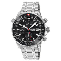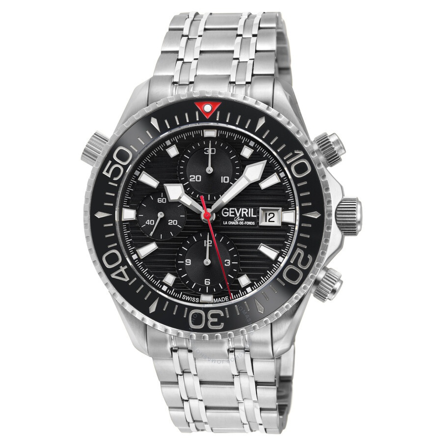 Silver-tone stainless steel case and bracelet. Uni-directional rotating black stainless steel bezel. Black dial with silver-tone hands and index hour markers. Minute markers around the outer rim. Dial Type: Analog. Luminescent hands and markers. Date display at the 3 o'clock position. Chronograph - three sub-dials displaying: 60 second, 30 minute and 12 hour. Sellita Caliber SW500 Automatic movement, containing 25 Jewels, bitting at 28800 vph, and has a power reserve of approximately 44 hours. Scratch resistant sapphire crystal. Screw down crown. Transparent case back. Round case shape, case size: 43 mm, case thickness: 17 mm. Band width: 20 mm. Deployment with push button release clasp. Water resistant at 300 meters / 1000 feet. Functions: chronograph, date, day, hour, minute, small second. Additional Info: helium release valve, chronograph. Hudson Yards Chronograph Series. Luxury watch style. Watch label: Swiss Made. Gevril Hudson Yards Chronograph Automatic Black Dial Men's Watch 48810B. GENERAL Box Type: Original Box CASE Case Size: 43 Case Thickness: 17 mm Case Material: Stainless Steel Case Shape: Round Case Back: Transparent BAND Band Material: Stainless Steel Band Type: Bracelet Band Color: Silver-tone Band Width: 20 mm Clasp: Deployment with Push Button Release DIAL Dial Color: Black Type: Analog Crystal: Scratch Resistant Sapphire Hands: Silver-tone Dial Markers: Index Second Markers: Minute Markers around the outer rim Sub Dials: Three - 60 Second, 30 Minute and 12 Hour Luminiscence: Hands and Markers Bezel: Uni-directional Rotating Bezel Color: Black Bezel Material: Stainless Steel Crown: Screw Down INFORMATION Brand: Gevril Series: Hudson Yards Chronograph Collection Name: Hudson Yards Chronograph Gender: Mens Model: 48810B Watch Label: Swiss Made Movement: Automatic Engine: Sellita Caliber SW500 Power Reserve: 44 hours FEATURES Water Resistance: 300 meters / 1000 feet Calendar: Date display at the 3 o'clock position Functions: Chronograph, Date, Day, Hour, Minute, Small Second Watch Features: Analog, Stainless Steel, Chronograph ADDITIONAL INFO Watch Style: Luxury Warranty: https://www.gevril.com/pages/watch-repair-shop-and UPC Code: 840840140630 Additional Info: Helium Release valve, chronograph Jomashop Sku: Y-A34EV Department: Watches Category: Watches
