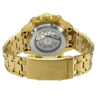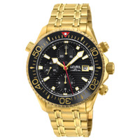 Yellow gold-tone stainless steel case and bracelet. Uni-directional rotating yellow gold-tone stainless steel bezel. Black dial with yellow gold-tone hands and index hour markers. Minute markers around the outer rim. Dial Type: Analog. Luminescent hands and markers. Date display at the 3 o'clock position. Chronograph - three sub-dials displaying: 60 second, 30 minute and 12 hour. Sellita Caliber SW500 Automatic movement, containing 25 Jewels, bitting at 28800 vph, and has a power reserve of approximately 44 hours. Scratch resistant sapphire crystal. Screw down crown. Transparent case back. Round case shape, case size: 43 mm, case thickness: 17 mm. Band width: 20 mm. Deployment with push button release clasp. Water resistant at 300 meters / 1000 feet. Functions: chronograph, date, day, hour, minute, small second. Additional Info: helium release valve, chronograph. Hudson Yards Chronograph Series. Luxury watch style. Watch label: Swiss Made. Gevril Hudson Yards Chronograph Automatic Black Dial Men's Watch 48811B. INFORMATION Brand: Gevril Series: Hudson Yards Chronograph Collection Name: Hudson Yards Chronograph Gender: Mens Model: 48811B Watch Label: Swiss Made Movement: Automatic Engine: Sellita Caliber SW500 Power Reserve: 44 hours CASE Case Size: 43 mm Case Thickness: 17 mm Case Material: Stainless Steel Case Shape: Round Case Back: Transparent BAND Band Material: Stainless Steel Band Type: Bracelet Band Color: Yellow Gold-tone Band Width: 20 mm Clasp: Deployment with Push Button Release DIAL Dial Color: Black Type: Analog Crystal: Scratch Resistant Sapphire Hands: Yellow Gold-tone Dial Markers: Index Second Markers: Minute Markers around the outer rim Sub Dials: Three - 60 Second, 30 Minute and 12 Hour Luminiscence: Hands and Markers Bezel: Uni-directional Rotating Bezel Color: Yellow Gold-tone Bezel Material: Stainless Steel Crown: Screw Down FEATURES Water Resistance: 300 meters / 1000 feet Calendar: Date display at the 3 o'clock position Functions: Chronograph, Date, Day, Hour, Minute, Small Second Watch Features: Chronograph, Stainless Steel, Gold, Analog ADDITIONAL INFO Watch Style: Luxury Warranty: With Manufacturers Guarantee UPC Code: 840840140647 Additional Info: Helium Release valve, chronograph Jomashop Sku: Y-A2XG5 Department: Watches Category: Watches