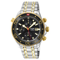 Silver-tone stainless steel case with a two-tone (silver-tone and yellow gold-tone) stainless steel bracelet. Uni-directional rotating black stainless steel bezel. Black dial with yellow gold-tone hands and index hour markers. Minute markers around the outer rim. Dial Type: Analog. Luminescent hands and markers. Date display at the 3 o'clock position. Chronograph - three sub-dials displaying: 60 second, 30 minute and 12 hour. Sellita Caliber SW500 Automatic movement, containing 25 Jewels, bitting at 28800 vph, and has a power reserve of approximately 44 hours. Scratch resistant sapphire crystal. Screw down crown. Transparent case back. Round case shape, case size: 43 mm, case thickness: 17 mm. Band width: 20 mm. Deployment with push button release clasp. Water resistant at 300 meters / 1000 feet. Functions: chronograph, date, day, hour, minute, small second. Additional Info: helium release valve, chronograph. Hudson Yards Chronograph Series. Luxury watch style. Watch label: Swiss Made. Gevril Hudson Yards Chronograph Automatic Black Dial Men's Watch 48812B. GENERAL Box Type: Original Box CASE Case Size: 43 Case Thickness: 17 mm Case Material: Stainless Steel Case Shape: Round Case Back: Transparent BAND Band Material: Stainless Steel Band Type: Bracelet Band Color: Two-tone (Silver-tone and Yellow Gold-tone) Band Width: 20 mm Clasp: Deployment with Push Button Release DIAL Dial Color: Black Type: Analog Crystal: Scratch Resistant Sapphire Hands: Yellow Gold-tone Dial Markers: Index Second Markers: Minute Markers around the outer rim Sub Dials: Three - 60 Second, 30 Minute and 12 Hour Luminiscence: Hands and Markers Bezel: Uni-directional Rotating Bezel Color: Black Bezel Material: Stainless Steel Crown: Screw Down INFORMATION Brand: Gevril Series: Hudson Yards Chronograph Collection Name: Hudson Yards Chronograph Gender: Mens Model: 48812B Watch Label: Swiss Made Movement: Automatic Engine: Sellita Caliber SW500 Power Reserve: 44 hours FEATURES Water Resistance: 300 meters / 1000 feet Calendar: Date display at the 3 o'clock position Functions: Chronograph, Date, Day, Hour, Minute, Small Second Watch Features: Analog, Gold, Stainless Steel, Chronograph ADDITIONAL INFO Watch Style: Luxury Warranty: https://www.gevril.com/pages/watch-repair-shop-and UPC Code: 840840140654 Additional Info: Helium Release valve, chronograph Jomashop Sku: Y-A2XFY Department: Watches Category: Watches