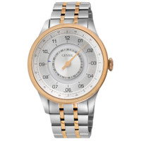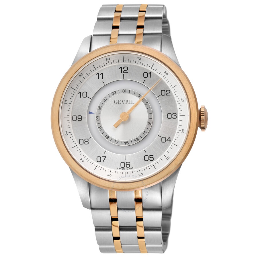 Silver-tone stainless steel case with a two-tone (silver-tone and rose gold-tone) stainless steel bracelet. Fixed rose gold-tone stainless steel bezel. Silver-tone dial with rose gold-tone hands and Arabic numeral hour markers. Minute scale. Dial Type: Analog. Date display around the inner rim. Sellita Caliber SW200 Automatic movement, containing 26 Jewels, bitting at 28800 vph, and has a power reserve of approximately 38 hours. Scratch resistant sapphire crystal. Pull / push crown. Round case shape, case size: 45 mm, case thickness: 12 mm. Band width: 20 mm. Deployment with push button release clasp. Water resistant at 50 meters / 165 feet. Functions: date, hour, minute, second. Additional Info: sunray and sandblast dial, date wheel on dial, 1 hand time indicator. Jones St Series. Luxury watch style. Watch label: Swiss Made. Gevril Jones St Automatic Silver Dial Men's Watch 2103. INFORMATION Brand: Gevril Series: Jones St Collection Name: Jones St Gender: Mens Model: 2103 Watch Label: Swiss Made Movement: Automatic Engine: Sellita Caliber SW200 Power Reserve: 38 hours CASE Case Size: 45 mm Case Thickness: 12 mm Case Material: Stainless Steel Case Shape: Round BAND Band Material: Stainless Steel Band Type: Bracelet Band Color: Two-tone (Silver-tone and Rose Gold-tone) Band Width: 20 mm Clasp: Deployment with Push Button Release DIAL Dial Color: Silver-tone Type: Analog Crystal: Scratch Resistant Sapphire Hands: Rose Gold-tone Dial Markers: Arabic Numeral Second Markers: Minute Scale Bezel: Fixed Bezel Color: Rose Gold-tone Bezel Material: Stainless Steel Crown: Pull / Push FEATURES Water Resistance: 50 meters / 165 feet Calendar: Date display around the inner rim Functions: Date, Hour, Minute, Second Watch Features: Stainless Steel, Gold, Analog ADDITIONAL INFO Watch Style: Luxury Warranty: With Manufacturers Guarantee UPC Code: 840840140142 Additional Info: Sunray and Sandblast Dial, Date wheel on dial, 1 hand time indicator Jomashop Sku: Y-A2LBS Department: Watches Category: Watches