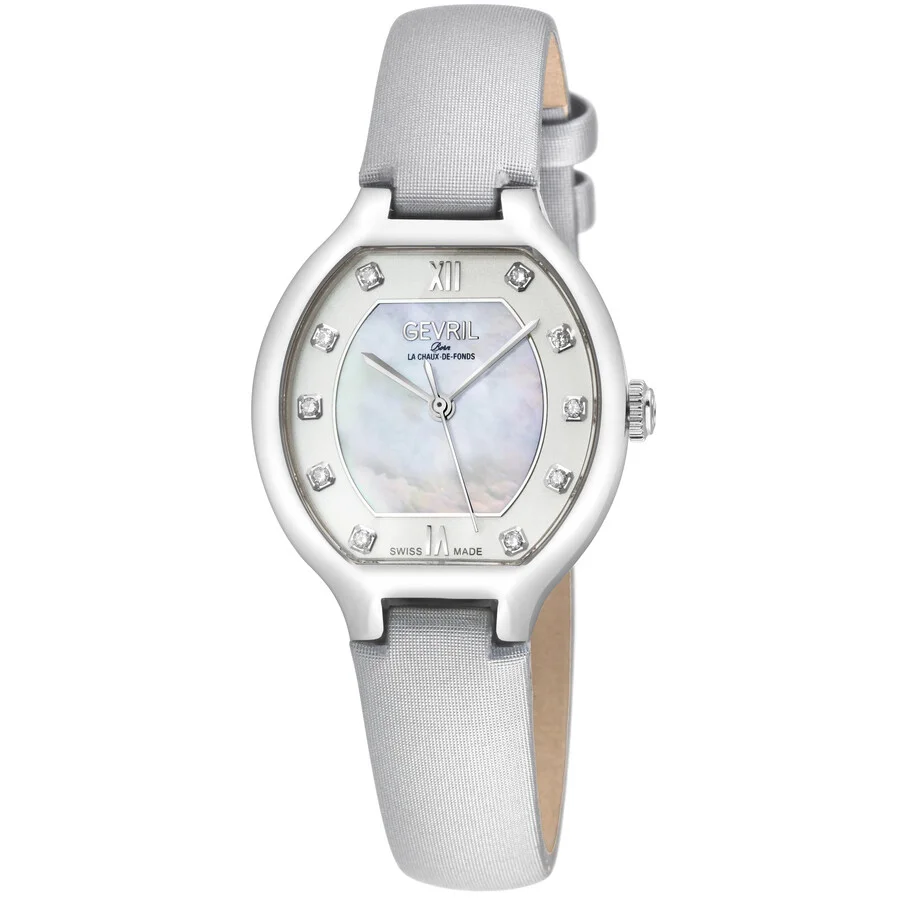Silver-tone stainless steel case with a silver-tone calfskin band. Fixed silver-tone stainless steel bezel. Mother of pearl dial with silver-tone hands and diamond hour markers. Dial Type: Analog. Ronda Caliber 763.2 quartz movement. Scratch resistant sapphire crystal. Pull / push crown. Solid case back. Cushion case shape, case size: 30 mm, case thickness: 8.4 mm. Band width: 14 mm. Buckle clasp. Water resistant at 50 meters / 165 feet. Functions: hour, minute, second. Additional Info: diamonds. Lugano Series. Luxury watch style. Watch label: Swiss Made. Gevril Lugano Diamond Mother of Pearl Dial Ladies Watch 14041.1. GENERAL Box Type: Original Box CASE Case Thickness: 8.4 mm Case Material: Stainless Steel Case Shape: Cushion Case Back: Solid BAND Band Material: Calfskin Band Type: Strap Band Color: Silver-tone Band Width: 14 mm Clasp: Buckle DIAL Dial Color: Mother of Pearl Type: Analog Crystal: Scratch Resistant Sapphire Hands: Silver-tone Dial Markers: Diamond Bezel: Fixed Bezel Color: Silver-tone Bezel Material: Stainless Steel Crown: Pull / Push INFORMATION Brand: Gevril Series: Lugano Collection Name: Lugano Gender: Womens Model: 14041.1 Watch Label: Swiss Made Movement: Quartz Engine: Ronda Caliber 763.2 FEATURES Water Resistance: 50 meters / 165 feet Functions: Hour, Minute, Second Watch Features: Analog, Stainless Steel, Diamond ADDITIONAL INFO Watch Style: Luxury Warranty: With Manufacturers Guarantee UPC Code: 840840151131 Additional Info: Diamonds Jomashop Sku: Y-A5VUK Department: Watches