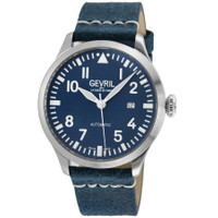 Silver-tone stainless steel case with a blue genuine leather strap. Fixed silver-tone stainless steel bezel. Blue dial with silver-tone hands and Arabic & index hour markers. Minute markers around the outer rim. Dial Type: Analog. Luminescent hands and markers. Date display at the 3 o'clock position. Sellita Caliber SW200 Automatic movement, containing 26 Jewels, bitting at 28800 vph, and has a power reserve of approximately 38 hours. Scratch resistant sapphire crystal. Pull / push crown. Transparent case back. Round case shape, case size: 44 mm, case thickness: 11.5 mm. Band width: 20 mm. Buckle clasp. Water resistant at 50 meters / 165 feet. Functions: date, hour, minute, second. Vaughn Series. Luxury watch style. Watch label: Swiss Made. Gevril Vaughn Automatic Blue Dial Men's Watch 43503. INFORMATION Brand: Gevril Series: Vaughn Collection Name: Vaughn Gender: Mens Model: 43503 Watch Label: Swiss Made Movement: Automatic Engine: Sellita Caliber SW200 Power Reserve: 38 hours CASE Case Size: 44 mm Case Thickness: 11.5 mm Case Material: Stainless Steel Case Shape: Round Case Back: Transparent BAND Band Material: Genuine Leather Band Type: Strap Band Color: Blue Band Width: 20 mm Clasp: Buckle DIAL Dial Color: Blue Type: Analog Crystal: Scratch Resistant Sapphire Hands: Silver-tone Dial Markers: Arabic & Index Second Markers: Minute Markers around the outer rim Luminiscence: Hands and Markers Bezel: Fixed Bezel Color: Silver-tone Bezel Material: Stainless Steel Crown: Pull / Push FEATURES Water Resistance: 50 meters / 165 feet Calendar: Date display at the 3 o'clock position Functions: Date, Hour, Minute, Second Watch Features: Stainless Steel, Leather, Analog ADDITIONAL INFO Watch Style: Luxury Warranty: With Manufacturers Guarantee UPC Code: 840840132109 Jomashop Sku: Y-A24FQ Department: Watches Category: Watches