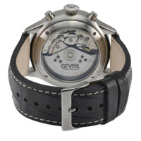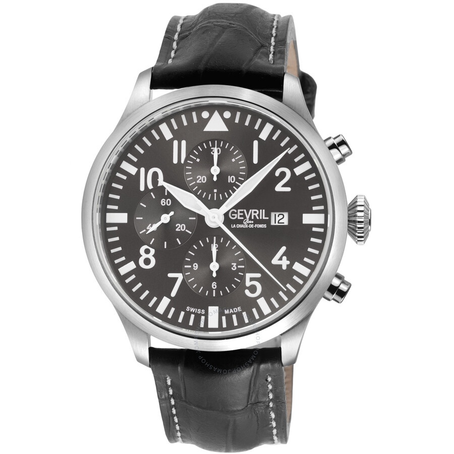 Silver-tone stainless steel case with a black genuine leather strap. Fixed silver-tone stainless steel bezel. Grey dial with silver-tone hands and Arabic numeral & index hour markers. Minute markers around the outer rim. Dial Type: Analog. Luminescent hands and markers. Date display at the 3 o'clock position. Chronograph - three sub-dials displaying: 60 second, 30 minute and 12 hour. ETA-Valjoux Caliber 7750 Automatic movement, containing 25 Jewels, bitting at 28800 vph, and has a power reserve of approximately 44 hours. Scratch resistant sapphire crystal. Pull / push crown. Transparent case back. Round case shape, case size: 44 mm, case thickness: 15.5 mm. Band width: 20 mm. Buckle clasp. Water resistant at 50 meters / 165 feet. Functions: chronograph, date, hour, minute, second. Additional Info: chronograph with 3 subdials 1/8-seconds counter, 30-minutes counter, 12-hours counter. Vaughn Series. Luxury watch style. Watch label: Swiss Made. Gevril Vaughn Chronograph Automatic Grey Dial Men's Watch 47102. INFORMATION Brand: Gevril Series: Vaughn Collection Name: Vaughn Gender: Mens Model: 47102 Watch Label: Swiss Made Movement: Automatic Engine: ETA-Valjoux Caliber 7750 Power Reserve: 44 hours CASE Case Size: 44 mm Case Thickness: 15.5 mm Case Material: Stainless Steel Case Shape: Round Case Back: Transparent BAND Band Material: Genuine Leather Band Type: Strap Band Color: Black Band Width: 20 mm Clasp: Buckle DIAL Dial Color: Grey Type: Analog Crystal: Scratch Resistant Sapphire Hands: Silver-tone Dial Markers: Arabic Numeral & Index Second Markers: Minute Markers around the outer rim Sub Dials: Three - 60 Second, 30 Minute and 12 Hour Luminiscence: Hands and Markers Bezel: Fixed Bezel Color: Silver-tone Bezel Material: Stainless Steel Crown: Pull / Push FEATURES Water Resistance: 50 meters / 165 feet Calendar: Date display at the 3 o'clock position Functions: Chronograph, Date, Hour, Minute, Second Watch Features: Chronograph, Stainless Steel, Leather, Analog ADDITIONAL INFO Watch Style: Luxury Warranty: With Manufacturers Guarantee UPC Code: 840840140357 Additional Info: chronograph with 3 subdials 1/8-seconds counter, 30-minutes counter, 12-hours counter Jomashop Sku: Y-A2Q8B Department: Watches Category: Watches