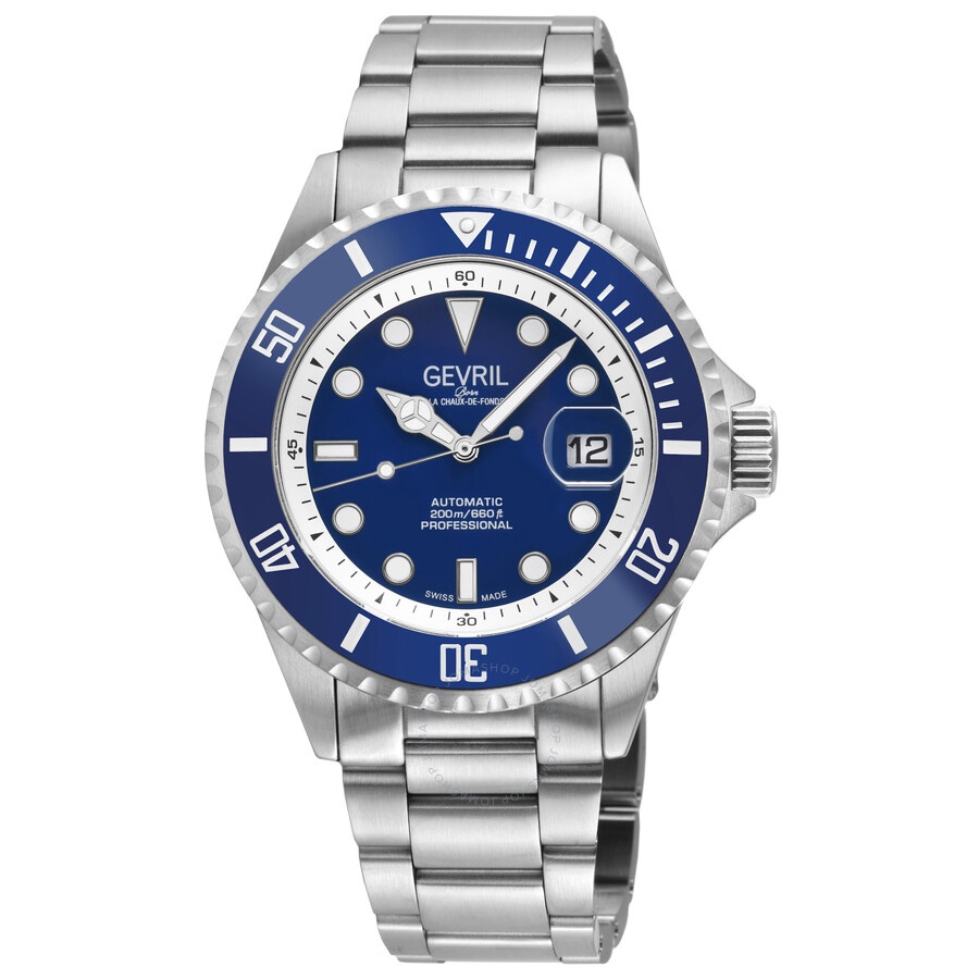 Silver-tone stainless steel case and bracelet. Uni-directional rotating blue ceramic bezel. Black dial with silver-tone hands and index hour markers. Minute markers around the outer rim. Dial Type: Analog. Luminescent hands and markers. Date display at the 3 o'clock position. Automatic movement. Scratch resistant sapphire crystal. Screw down crown. Solid case back. Round case shape, case size: 43 mm, case thickness: 13 mm. Band width: 20 mm. Deployment with push button release clasp. Water resistant at 200 meters / 660 feet. Functions: date, hour, minute, second. Additional Info: sellita sw200 Swiss automatic movement. Wall Street Series. Luxury watch style. Watch label: Swiss Made. Gevril Wall street Automatic Black Dial Men's Watch 41851A. GENERAL Box Type: Original Box CASE Case Size: 43 Case Thickness: 13 mm Case Material: Stainless Steel Case Shape: Round Case Back: Solid BAND Band Material: Stainless Steel Band Type: Bracelet Band Color: Silver-tone Band Width: 20 mm Clasp: Deployment with Push Button Release DIAL Dial Color: Black Type: Analog Crystal: Scratch Resistant Sapphire Hands: Silver-tone Dial Markers: Index Second Markers: Minute Markers around the outer rim Luminiscence: Hands and Markers Bezel: Uni-directional Rotating Bezel Color: Blue Bezel Material: Ceramic Crown: Screw Down INFORMATION Brand: Gevril Series: Wall Street Collection Name: Wall street Gender: Mens Model: 41851A Watch Label: Swiss Made Movement: Automatic FEATURES Water Resistance: 200 meters / 660 feet Calendar: Date display at the 3 o'clock position Functions: Date, Hour, Minute, Second Watch Features: Analog, Ceramic, Stainless Steel ADDITIONAL INFO Watch Style: Luxury Warranty: https://www.gevril.com/pages/watch-repair-shop-and UPC Code: 840840144829 Additional Info: Sellita SW200 Swiss automatic movement Jomashop Sku: Y-A4B4P Department: Watches Category: Watches