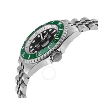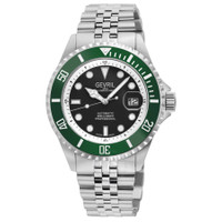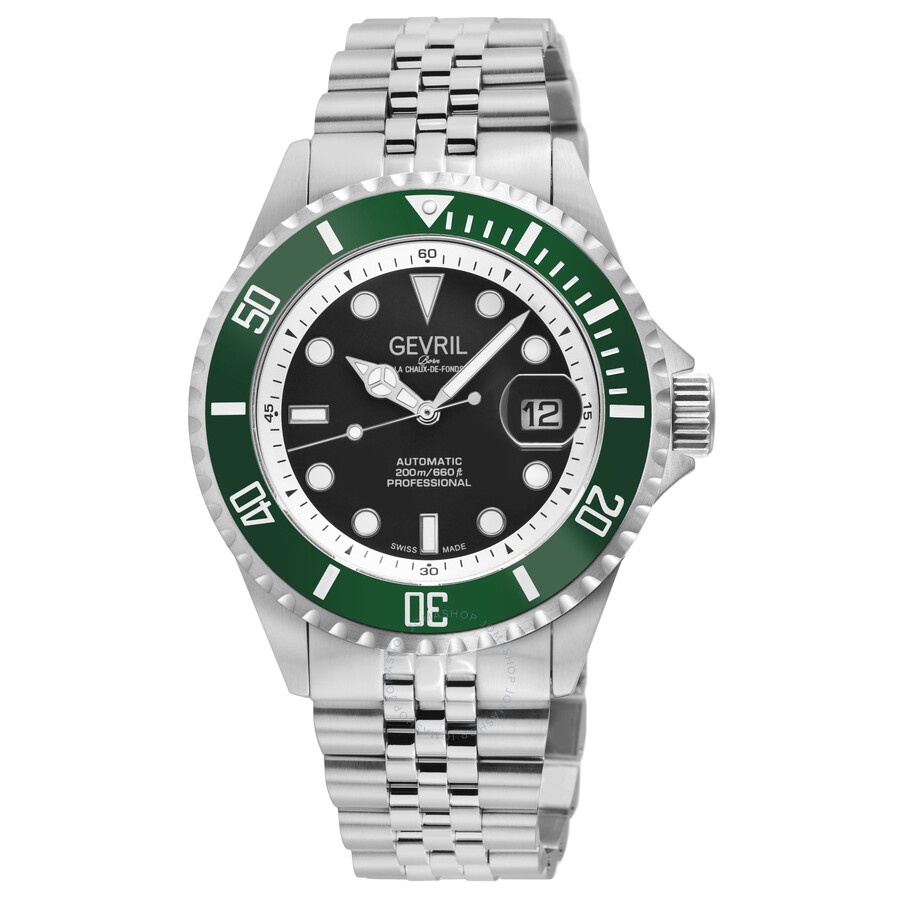 Silver-tone stainless steel case and bracelet. Uni-directional rotating green ceramic bezel. Black dial with silver-tone hands and index hour markers. Minute markers around the outer rim. Dial Type: Analog. Luminescent hands and markers. Date display at the 3 o'clock position. Automatic movement. Scratch resistant sapphire crystal. Screw down crown. Solid case back. Round case shape, case size: 43 mm, case thickness: 13 mm. Band width: 20 mm. Deployment with push button release clasp. Water resistant at 200 meters / 660 feet. Functions: date, hour, minute, second. Additional Info: sellita sw200 Swiss automatic movement. Wall Street Series. Luxury watch style. Watch label: Swiss Made. Gevril Wall street Automatic Black Dial Men's Watch 41852B. GENERAL Box Type: Original Box CASE Case Size: 43 Case Thickness: 13 mm Case Material: Stainless Steel Case Shape: Round Case Back: Solid BAND Band Material: Stainless Steel Band Type: Bracelet Band Color: Silver-tone Band Width: 20 mm Clasp: Deployment with Push Button Release DIAL Dial Color: Black Type: Analog Crystal: Scratch Resistant Sapphire Hands: Silver-tone Dial Markers: Index Second Markers: Minute Markers around the outer rim Luminiscence: Hands and Markers Bezel: Uni-directional Rotating Bezel Color: Green Bezel Material: Ceramic Crown: Screw Down INFORMATION Brand: Gevril Series: Wall Street Collection Name: Wall street Gender: Mens Model: 41852B Watch Label: Swiss Made Movement: Automatic FEATURES Water Resistance: 200 meters / 660 feet Calendar: Date display at the 3 o'clock position Functions: Date, Hour, Minute, Second Watch Features: Analog, Ceramic, Stainless Steel ADDITIONAL INFO Watch Style: Luxury Warranty: https://www.gevril.com/pages/watch-repair-shop-and UPC Code: 840840144775 Additional Info: Sellita SW200 Swiss automatic movement Jomashop Sku: Y-A4B4R Department: Watches Category: Watches
