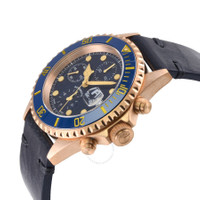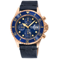 Rose gold-tone bronze case with a blue leather strap. Uni-directional rotating blue ceramic bezel. Blue dial with rose gold-tone hands and index hour markers. Minute markers around the outer rim. Dial Type: Analog. Luminescent hands and markers. Date display at the 3 o'clock position. Chronograph - three sub-dials displaying: 60 second, 30 minute and 12 hour. ETA-Valjoux Caliber 7750 Automatic movement, containing 25 Jewels, bitting at 28800 vph, and has a power reserve of approximately 44 hours. Scratch resistant sapphire crystal. Screw down crown. Transparent case back. Round case shape, case size: 44 mm, case thickness: 16 mm. Band width: 22 mm. Buckle clasp. Water resistant at 100 meters / 330 feet. Functions: chronograph, date, day, hour, minute, second. Additional Info: bronze case, chronograph. Wallstreet Series. Luxury watch style. Watch label: Swiss Made. Gevril Wallstreet Chronograph Automatic Blue Dial Men's Watch 4160. INFORMATION Brand: Gevril Series: Wallstreet Collection Name: Wallstreet Gender: Mens Model: 4160 Watch Label: Swiss Made Movement: Automatic Engine: ETA-Valjoux Caliber 7750 Power Reserve: 44 hours CASE Case Size: 44 mm Case Thickness: 16 mm Case Material: Bronze Case Shape: Round Case Back: Transparent BAND Band Material: Leather Band Type: Strap Band Color: Blue Band Width: 22 mm Clasp: Buckle DIAL Dial Color: Blue Type: Analog Crystal: Scratch Resistant Sapphire Hands: Rose Gold-tone Dial Markers: Index Second Markers: Minute Markers around the outer rim Sub Dials: Three - 60 Second, 30 Minute and 12 Hour Luminiscence: Hands and Markers Bezel: Uni-directional Rotating Bezel Color: Blue Bezel Material: Ceramic Crown: Screw Down FEATURES Water Resistance: 100 meters / 330 feet Calendar: Date display at the 3 o'clock position Functions: Chronograph, Date, Day, Hour, Minute, Second Watch Features: Chronograph, Leather, Gold, Ceramic, Analog ADDITIONAL INFO Watch Style: Luxury Warranty: With Manufacturers Guarantee UPC Code: 840840144348 Additional Info: Bronze case, chronograph Jomashop Sku: Y-A42KU Department: Watches Category: Watches