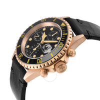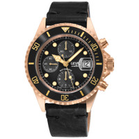 Rose gold-tone bronze case with a black leather strap. Uni-directional rotating black ceramic bezel. Black dial with rose gold-tone hands and index hour markers. Minute markers around the outer rim. Dial Type: Analog. Luminescent hands and markers. Date display at the 3 o'clock position. Chronograph - three sub-dials displaying: 60 second, 30 minute and 12 hour. ETA-Valjoux Caliber 7750 Automatic movement, containing 25 Jewels, bitting at 28800 vph, and has a power reserve of approximately 44 hours. Scratch resistant sapphire crystal. Screw down crown. Transparent case back. Round case shape, case size: 44 mm, case thickness: 16 mm. Band width: 22 mm. Buckle clasp. Water resistant at 100 meters / 330 feet. Functions: chronograph, date, day, hour, minute, second. Additional Info: bronze case, chronograph. Wallstreet Series. Luxury watch style. Watch label: Swiss Made. Gevril Wallstreet Chronograph Black Dial Men's Watch 4167. GENERAL Box Type: Original Box CASE Case Size: 44 Case Thickness: 16 mm Case Material: Bronze Case Shape: Round Case Back: Transparent BAND Band Material: Leather Band Type: Strap Band Color: Black Band Width: 22 mm Clasp: Buckle DIAL Dial Color: Black Type: Analog Crystal: Scratch Resistant Sapphire Hands: Rose Gold-tone Dial Markers: Index Second Markers: Minute Markers around the outer rim Sub Dials: Three - 60 Second, 30 Minute and 12 Hour Luminiscence: Hands and Markers Bezel: Uni-directional Rotating Bezel Color: Black Bezel Material: Ceramic Crown: Screw Down INFORMATION Brand: Gevril Series: Wallstreet Collection Name: Wallstreet Gender: Mens Model: 4167 Watch Label: Swiss Made Movement: Automatic Engine: ETA-Valjoux Caliber 7750 Power Reserve: 44 hours FEATURES Water Resistance: 100 meters / 330 feet Calendar: Date display at the 3 o'clock position Functions: Chronograph, Date, Day, Hour, Minute, Second Watch Features: Analog, Ceramic, Gold, Leather, Chronograph ADDITIONAL INFO Watch Style: Luxury Warranty: https://www.gevril.com/pages/watch-repair-shop-and UPC Code: 840840144362 Additional Info: Bronze case, chronograph Jomashop Sku: Y-A42KW Department: Watches Category: Watches