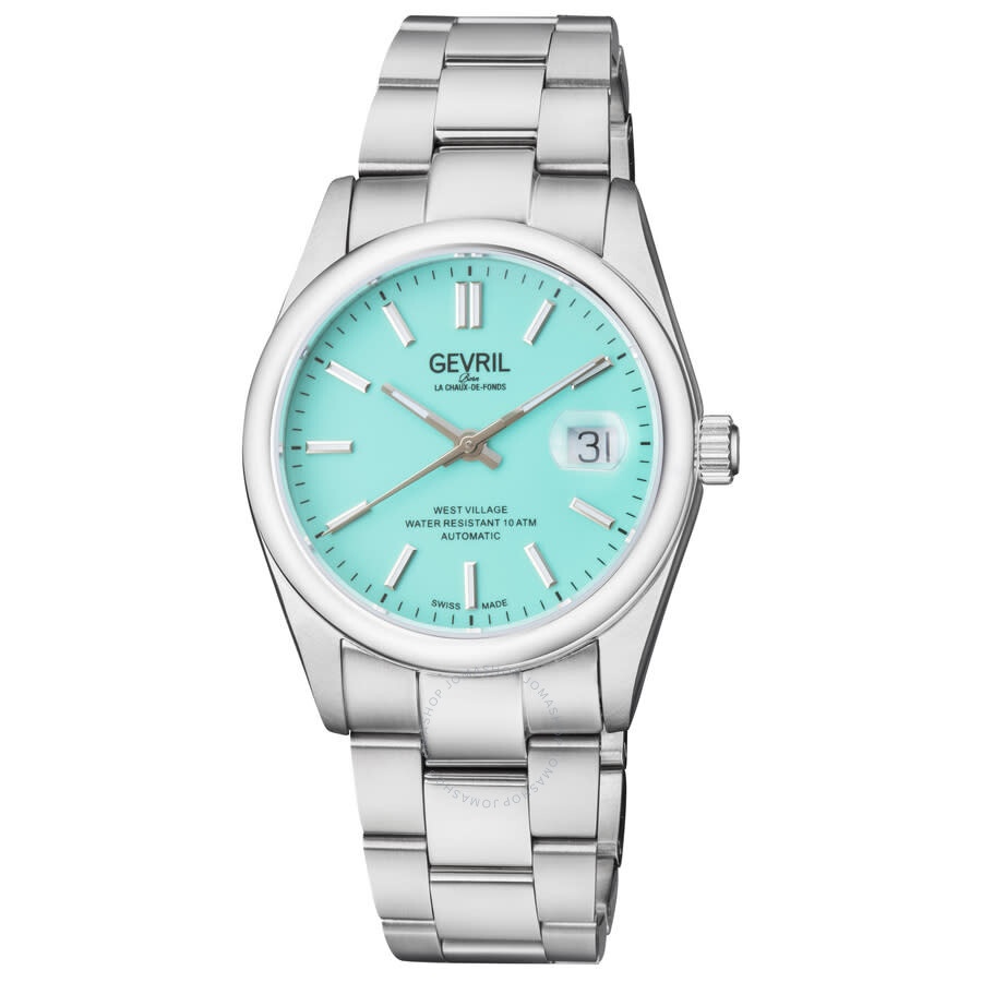 Stainless steel case with a stainless steel bracelet. Fixed stainless steel bezel. Blue dial with luminous silver-tone hands and index hour markers. Minute markers around the outer rim. Dial Type: Analog. Luminescent hands and markers. Date display at the 3 o'clock position. Sellita caliber SW200 automatic movement, containing 26 Jewels, bitting at 28800 vph, and has a power reserve of approximately 38 hours. Scratch resistant sapphire crystal. Screw down crown. Transparent case back. Round case shape. Case size: 40 mm. Case thickness: 12.5 mm. Band width: 20 mm. Deployment clasp with a push button release. Water resistant at 100 meters / 330 feet. Functions: date, hour, minute, second. Additional Info: tapered bracelet, magnified date window. West Village Series. Luxury watch style. Watch label: Swiss Made. Gevril West Village Automatic Blue Dial Men's Watch 48913. INFORMATION Brand: Gevril Series: West Village Collection Name: West Village Gender: Mens Model: 48913 Watch Label: Swiss Made Movement: Automatic Engine: Sellita Caliber SW200 Power Reserve: 38 hours CASE Case Size: 40 mm Case Thickness: 12.5 mm Case Material: Stainless Steel Case Shape: Round Case Back: Transparent BAND Band Material: Stainless Steel Band Type: Bracelet Band Color: Silver-tone Band Width: 20 mm Clasp: Deployment with Push Button Release DIAL Dial Color: Blue Type: Analog Crystal: Scratch Resistant Sapphire Hands: Luminous Silver-tone Dial Markers: Index Second Markers: Minute Markers around the outer rim Luminiscence: Hands and Markers Bezel: Fixed Bezel Color: Silver-tone Bezel Material: Stainless Steel Crown: Screw Down FEATURES Water Resistance: 100 meters / 330 feet Calendar: Date display at the 3 o'clock position Functions: Date, Hour, Minute, Second Watch Features: Stainless Steel, Analog ADDITIONAL INFO Watch Style: Luxury Warranty: With Manufacturers Guarantee UPC Code: 840840126405 Additional Info: tapered bracelet, magnified date window Jomashop Sku: Y-158896 Department: Watches Category: Watches