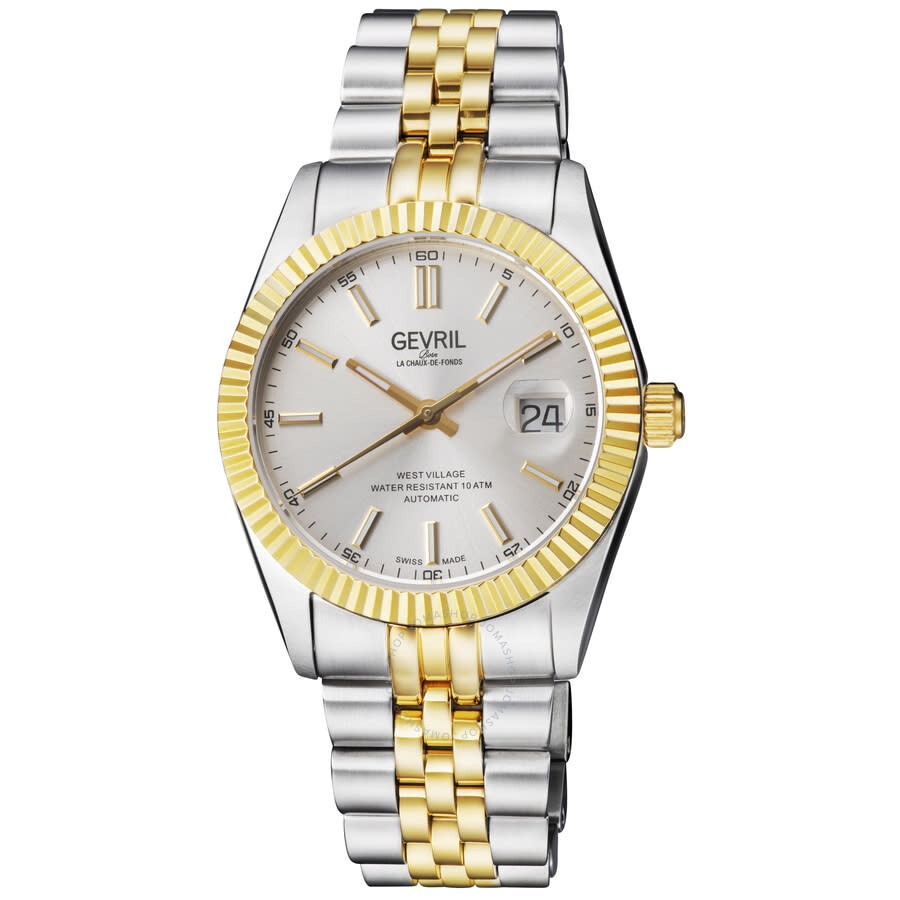 Stainless steel case with a two-tone (silver-tone and yellow gold-tone) stainless steel bracelet. Fixed fluted yellow gold-tone bezel. Silver dial with luminous yellow gold-tone hands and index hour markers. Arabic numeral minute markers (at 5 minute intervals). Minute markers around the outer rim. Dial Type: Analog. Luminescent hands and markers. Date display at the 3 o'clock position. Sellita caliber SW200 automatic movement, containing 26 Jewels, bitting at 28800 vph, and has a power reserve of approximately 38 hours. Scratch resistant sapphire crystal. Screw down crown. Transparent case back. Round case shape. Case size: 40 mm. Case thickness: 12.5 mm. Band width: 20 mm. Deployment clasp with a push button release. Water resistant at 100 meters / 330 feet. Functions: date, hour, minute, second. Additional Info: fluted bezel , tapered bracelet, magnified date window. West Village Series. Luxury watch style. Watch label: Swiss Made. Gevril West Village Automatic Silver Dial Men's Watch 48905. INFORMATION Brand: Gevril Series: West Village Collection Name: West Village Gender: Mens Model: 48905 Watch Label: Swiss Made Movement: Automatic Engine: Sellita Caliber SW200 Power Reserve: 38 hours CASE Case Size: 40 mm Case Thickness: 12.5 mm Case Material: Stainless Steel Case Shape: Round Case Back: Transparent BAND Band Material: Stainless Steel Band Type: Bracelet Band Color: Two-tone (Silver-tone and Yellow Gold-tone) Band Width: 20 mm Clasp: Deployment with Push Button Release DIAL Dial Color: Silver Type: Analog Crystal: Scratch Resistant Sapphire Hands: Luminous Yellow Gold-tone Dial Markers: Index Second Markers: Arabic Numeral Minute markers (at 5 minute intervals). Minute Markers around the outer rim Luminiscence: Hands and Markers Bezel: Fixed Fluted Bezel Color: Yellow Gold-tone Bezel Material: Stainless Steel Crown: Screw Down FEATURES Water Resistance: 100 meters / 330 feet Calendar: Date display at the 3 o'clock position Functions: Date, Hour, Minute, Second Watch Features: Stainless Steel, Gold, Analog ADDITIONAL INFO Watch Style: Luxury Warranty: With Manufacturers Guarantee UPC Code: 840840126368 Additional Info: fluted bezel , tapered bracelet, magnified date window Jomashop Sku: Y-158918 Department: Watches Category: Watches