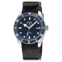 Silver-tone stainless steel case with a black canvas strap. Uni-directional rotating blue stainless steel bezel. Blue dial with silver-tone hands and index hour markers. Minute markers around the outer rim. Dial Type: Analog. Luminescent hands and markers. Date display at the 3 o'clock position. Sellita Caliber SW200 Automatic movement, containing 26 Jewels, bitting at 28800 vph, and has a power reserve of approximately 38 hours. Scratch resistant sapphire crystal. Screw down crown. Round case shape, case size: 43 mm, case thickness: 13 mm. Band width: 22 mm. Buckle clasp. Water resistant at 200 meters / 660 feet. Functions: date, hour, minute, second. Yorkville Series. Luxury watch style. Watch label: Swiss Made. Gevril Yorkville Automatic Blue Dial Men's Watch 48601N. INFORMATION Brand: Gevril Series: Yorkville Collection Name: Yorkville Gender: Mens Model: 48601N Watch Label: Swiss Made Movement: Automatic Engine: Sellita Caliber SW200 Power Reserve: 38 hours CASE Case Size: 43 mm Case Thickness: 13 mm Case Material: Stainless Steel Case Shape: Round BAND Band Material: Canvas Band Type: Strap Band Color: Black Band Width: 22 mm Clasp: Buckle DIAL Dial Color: Blue Type: Analog Crystal: Scratch Resistant Sapphire Hands: Silver-tone Dial Markers: Index Second Markers: Minute Markers around the outer rim Luminiscence: Hands and Markers Bezel: Uni-directional Rotating Bezel Color: Blue Bezel Material: Stainless Steel Crown: Screw Down FEATURES Water Resistance: 200 meters / 660 feet Calendar: Date display at the 3 o'clock position Functions: Date, Hour, Minute, Second Watch Features: Stainless Steel, Analog ADDITIONAL INFO Watch Style: Luxury Warranty: With Manufacturers Guarantee UPC Code: 840840136510 Jomashop Sku: Y-A2FF6 Department: Watches Category: Watches