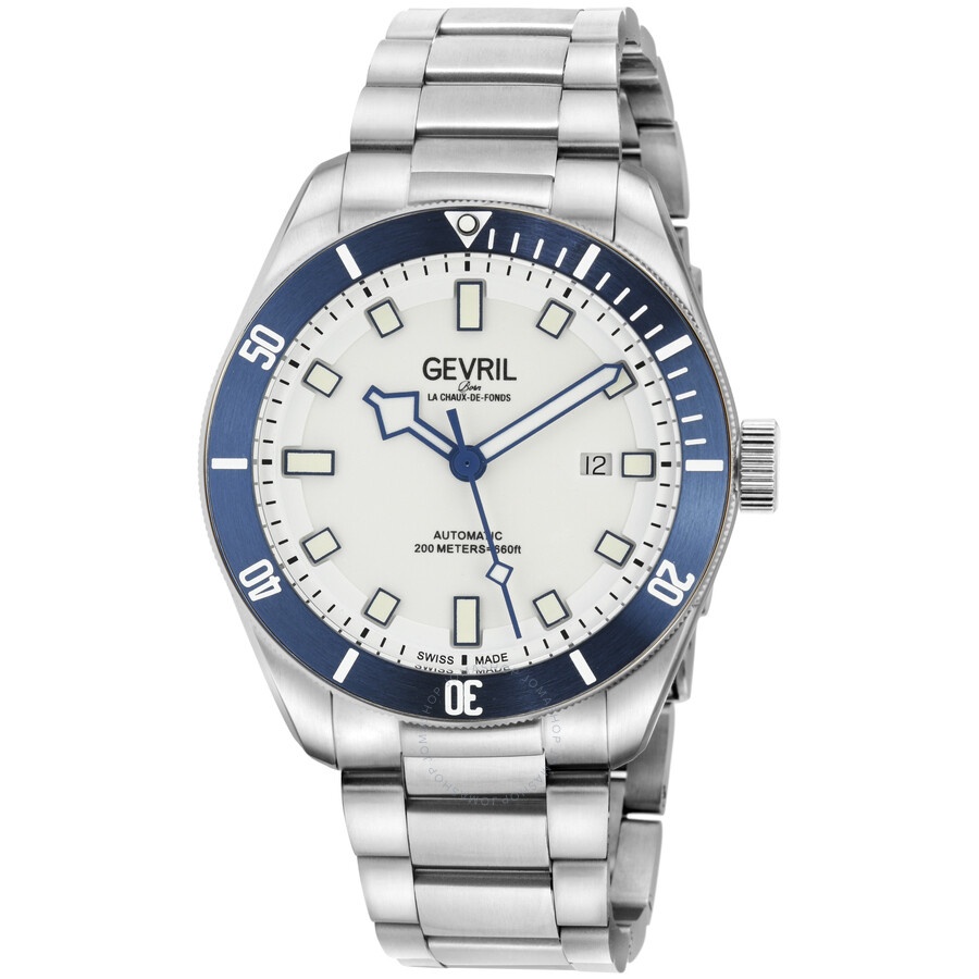 Silver-tone stainless steel case and bracelet. Uni-directional rotating blue stainless steel bezel. White dial with blue hands and index hour markers. Minute markers around the outer rim. Dial Type: Analog. Luminescent hands and markers. Date display at the 3 o'clock position. Sellita Caliber SW200 Automatic movement, containing 26 Jewels, bitting at 28800 vph, and has a power reserve of approximately 38 hours. Scratch resistant sapphire crystal. Screw down crown. Transparent case back. Round case shape, case size: 43 mm, case thickness: 13 mm. Band width: 20 mm. Deployment with push button release clasp. Water resistant at 200 meters / 660 feet. Functions: date, hour, minute, second. Additional Info: divers, luminous dial. Yorkville Series. Luxury watch style. Watch label: Swiss Made. Gevril Yorkville White Dial Men's Watch 48613B. GENERAL Box Type: Original Box CASE Case Size: 43 Case Thickness: 13 mm Case Material: Stainless Steel Case Shape: Round Case Back: Transparent BAND Band Material: Stainless Steel Band Type: Bracelet Band Color: Silver-tone Band Width: 20 mm Clasp: Deployment with Push Button Release DIAL Dial Color: White Type: Analog Crystal: Scratch Resistant Sapphire Hands: Blue Dial Markers: Index Second Markers: Minute Markers around the outer rim Luminiscence: Hands and Markers Bezel: Uni-directional Rotating Bezel Color: Blue Bezel Material: Stainless Steel Crown: Screw Down INFORMATION Brand: Gevril Series: Yorkville Collection Name: Yorkville Gender: Mens Model: 48613B Watch Label: Swiss Made Movement: Automatic Engine: Sellita Caliber SW200 Power Reserve: 38 hours FEATURES Water Resistance: 200 meters / 660 feet Calendar: Date display at the 3 o'clock position Functions: Date, Hour, Minute, Second Watch Features: Analog, Stainless Steel ADDITIONAL INFO Watch Style: Luxury Warranty: https://www.gevril.com/pages/watch-repair-shop-and UPC Code: 840840140951 Additional Info: Divers, luminous Dial Jomashop Sku: Y-A383K Department: Watches Category: Watches