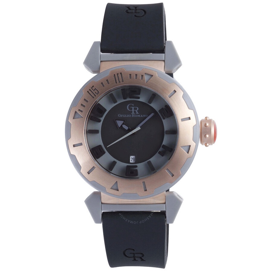 Grey-plated stainless steel case with a black silicone strap. Uni-directional rotating rose gold-tone bezel. Black dial with grey hands and alternating Arabic numeral and index hour markers. Dial Type: Analog. Luminescent hands. Date display above the 6 o'clock position. Quartz movement. Scratch resistant mineral crystal. Solid case back. Round case shape. Case size: 46 mm. Case thickness: 13 mm. Band width: 21 mm. Band length: 8.5 inches. Tang clasp. Water resistant at 100 meters / 330 feet. Functions: date, hour, minute, second. Ferrara Series. Casual watch style. Item Variations: GR-5000-13-007 09, GR-5000-13-007-09, GR-5000-13-007/09, GR-5000-13-00709. Giulio Romano Ferrara Quartz Black Dial Men's Watch GR-5000-13-007.09. CASE Case Size: 46 Case Thickness: 13 mm Case Material: Stainless Steel Case Shape: Round Case Back: Solid BAND Band Material: Silicone Band Type: Strap Band Color: Black Band Length: 8.5 inches Band Width: 21 mm Clasp: Tang DIAL Dial Color: Black Type: Analog Crystal: Scratch Resistant Mineral Hands: Grey Dial Markers: Alternating Arabic Numeral and Index Luminiscence: Hands Bezel: Uni-directional Rotating Bezel Color: Rose Gold-tone INFORMATION Brand: Giulio Romano Series: Ferrara Collection Name: Ferrara Gender: Mens Model: GR-5000-13-007.09 Movement: Quartz FEATURES Water Resistance: 100 meters / 330 feet Calendar: Date display above the 6 o'clock position Functions: Date, Hour, Minute, Second Watch Features: Stainless Steel, Gold, Analog ADDITIONAL INFO Watch Style: Casual Warranty: 2 Year Jomashop Warranty UPC Code: 846341077710 Jomashop Sku: Z-2YRYC Item Variation: GR-5000-13-007 09, GR-5000-13-007-09, GR-5000-13-007/09, GR-5000-13-00709 Department: Watches