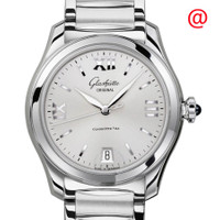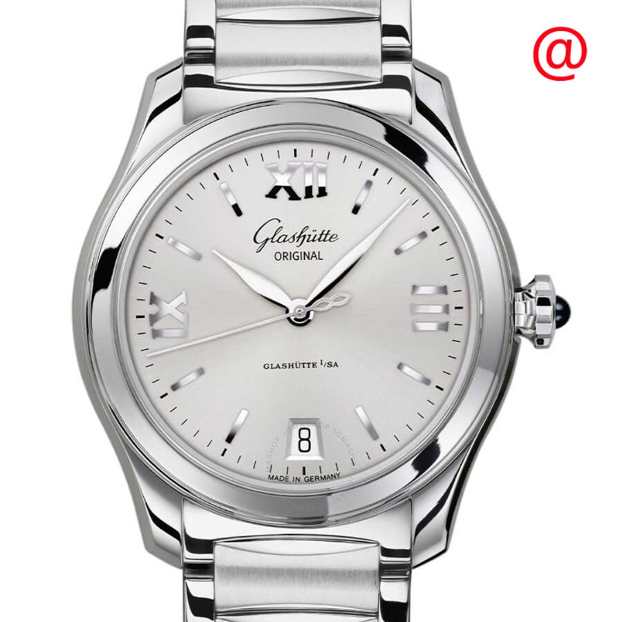Silver-tone stainless steel case and bracelet. Fixed silver-tone stainless steel bezel. Silver-tone dial with silver-tone hands and Roman numeral hour markers. Minute markers around the outer rim. Dial Type: Analog. Date display at the 6 o'clock position. Glashutte Calibre 39-22 Automatic movement, containing 24 Jewels, bitting at 28800 vph, and has a power reserve of approximately 40 hours. Scratch resistant sapphire crystal. Cabochon crown. Round case shape, case size: 36 mm. Fold over clasp. Water resistant at 50 meters / 165 feet. Functions: date, hour, minute, second. Additional Info: original box, international warranty card, manual (complete accessories). Lady Serenade Series. Luxury watch style. Watch label: Made in Germany. Glashutte Lady Serenade Automatic Silver Dial Ladies Watch 1-39-22-02-02-34. INFORMATION Brand: Glashutte Original Series: Lady Serenade Collection Name: Lady Serenade Gender: Womens Model: 1-39-22-02-02-34 Watch Label: Made in Germany Movement: Automatic Engine: Glashutte Calibre 39-22 Power Reserve: 40 hours CASE Case Size: 36 mm Case Material: Stainless Steel Case Shape: Round BAND Band Material: Stainless Steel Band Type: Bracelet Band Color: Silver-tone Clasp: Fold Over DIAL Dial Color: Silver-tone Type: Analog Crystal: Scratch Resistant Sapphire Hands: Silver-tone Dial Markers: Roman Numeral Second Markers: Minute Markers around the outer rim Bezel: Fixed Bezel Color: Silver-tone Bezel Material: Stainless Steel Crown: Cabochon FEATURES Water Resistance: 50 meters / 165 feet Calendar: Date display at the 6 o'clock position Functions: Date, Hour, Minute, Second Watch Features: Stainless Steel, Analog ADDITIONAL INFO Watch Style: Luxury Warranty: 2 Year Jomashop Warranty Additional Info: Original Box, International Warranty Card, Manual (Complete Accessories) Jomashop Sku: GLSH13922020234 Department: Watches Category: Watches