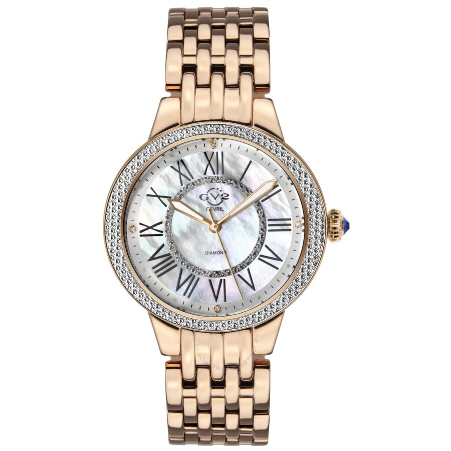 Rose gold-tone stainless steel case and bracelet. Fixed rose gold-tone (diamond cut) bezel. Mother of pearl (diamond cut ring) dial with luminous rose gold-tone sword-shaped hands and Roman numeral hour markers. Diamonds set at the 3, 6, 9 and 12 o'clock positions. Minute markers around the outer rim. Dial Type: Analog. Luminescent hands. Quartz movement. Scratch resistant sapphire crystal. Pull / push crown. Solid case back. Round case shape. Case size: 38 mm. Case thickness: 10 mm. Band width: 18 mm. Fold over clasp with push button release. Water resistant at 30 meters / 100 feet. Functions: hour, minute, second. Astor II Series. Fashion watch style. Watch label: Swiss Made. GV2 by Gevril Astor II Quartz Mother of Pearl Dial Diamond Ladies Watch 9141. INFORMATION Brand: Gv2 By Gevril Series: Astor Ii Collection Name: Astor II Gender: Womens Model: 9141 Watch Label: Swiss Made Movement: Quartz Engine: Ronda Caliber 1069 CASE Case Size: 38 mm Case Thickness: 10 mm Case Material: Stainless Steel Case Shape: Round Case Back: Solid BAND Band Material: Stainless Steel Band Type: Bracelet Band Color: Rose Gold-tone Band Width: 18 mm Clasp: Fold Over with Push Button Release DIAL Dial Color: Mother of Pearl (Diamond Cut Ring) Type: Analog Crystal: Scratch Resistant Sapphire Hands: Luminous Rose Gold-tone Sword-shaped Dial Markers: Roman Numeral Second Markers: Diamonds set at the 3, 6, 9 and 12 o'clock positions. Minute Markers around the outer rim Luminiscence: Hands Bezel: Fixed Bezel Color: Rose Gold-tone Bezel Material: (Diamond Cut) Stainless Steel Crown: Pull / Push FEATURES Water Resistance: 30 meters / 100 feet Functions: Hour, Minute, Second Watch Features: Diamond, Stainless Steel, Gold, Analog ADDITIONAL INFO Watch Style: Fashion Warranty: With Manufacturers Guarantee UPC Code: 840840121561 Jomashop Sku: GER9141 Department: Watches Category: Watches