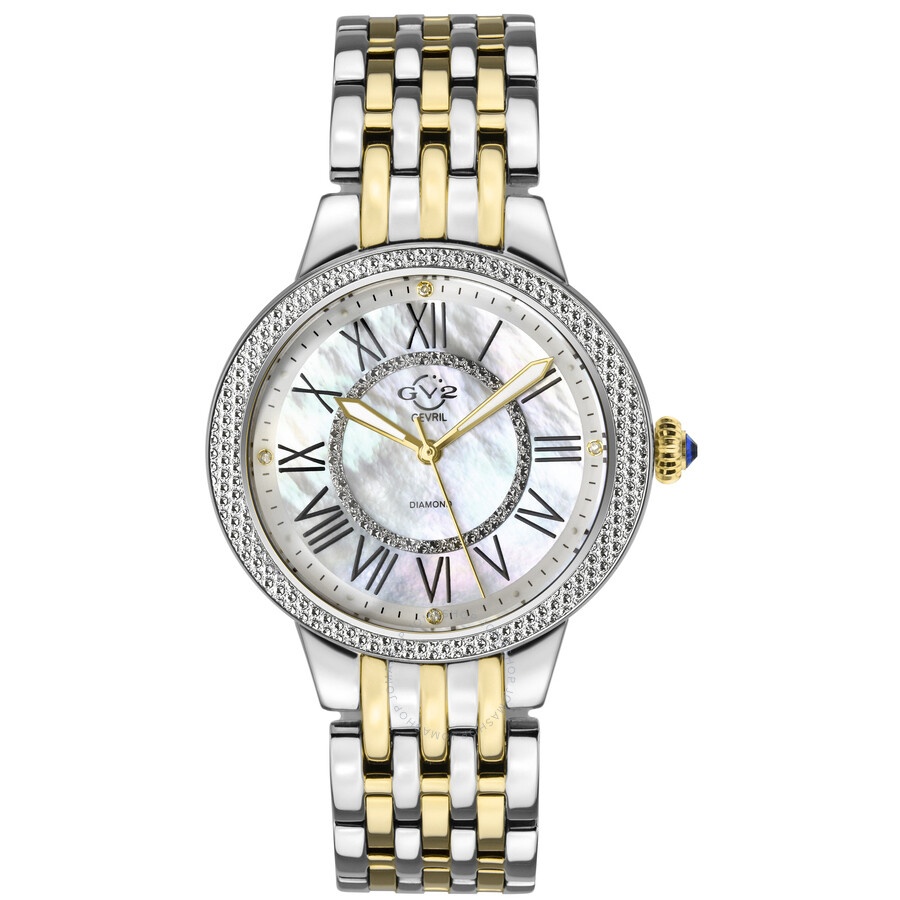 Stainless steel case with a two-tone (silver-tone and yellow gold-tone) stainless steel bracelet. Fixed stainless steel diamond cut bezel. Mother of pearl dial with gold-tone sword-shaped hands and Roman numeral hour markers. Diamonds set at the 3, 6, 9 and 12 o'clock positions. Minute markers around the outer rim. Dial Type: Analog. Luminescent hands. Quartz movement. Scratch resistant sapphire crystal. Pull / push crown. Solid case back. Round case shape. Case size: 38 mm. Case thickness: 10 mm. Band width: 18 mm. Deployment clasp with a push button release. Water resistant at 30 meters / 100 feet. Functions: hour, minute, second. Astor II Series. Fashion watch style. Watch label: Swiss Made. GV2 by Gevril Astor II Quartz Mother of Pearl Dial Diamond Ladies Watch 9145. INFORMATION Brand: Gv2 By Gevril Series: Astor Ii Collection Name: Astor II Gender: Womens Model: 9145 Watch Label: Swiss Made Movement: Quartz CASE Case Size: 38 mm Case Thickness: 10 mm Case Material: Stainless Steel Case Shape: Round Case Back: Solid BAND Band Material: Stainless Steel Band Type: Bracelet Band Color: Two-tone (Silver-tone and Yellow Gold-tone) Band Width: 18 mm Clasp: Deployment with Push Button Release DIAL Dial Color: Mother of Pearl Type: Analog Crystal: Scratch Resistant Sapphire Hands: Gold-tone Sword-shaped Dial Markers: Roman Numeral Second Markers: Diamonds set at the 3, 6, 9 and 12 o'clock positions. Minute Markers around the outer rim Luminiscence: Hands Bezel: Fixed Bezel Color: Silver-tone Bezel Material: Stainless Steel Diamond Cut Crown: Pull / Push FEATURES Water Resistance: 30 meters / 100 feet Functions: Hour, Minute, Second Watch Features: Diamond, Stainless Steel, Gold, Analog ADDITIONAL INFO Watch Style: Fashion Warranty: With Manufacturers Guarantee UPC Code: 840840121578 Jomashop Sku: GER9145 Department: Watches Category: Watches