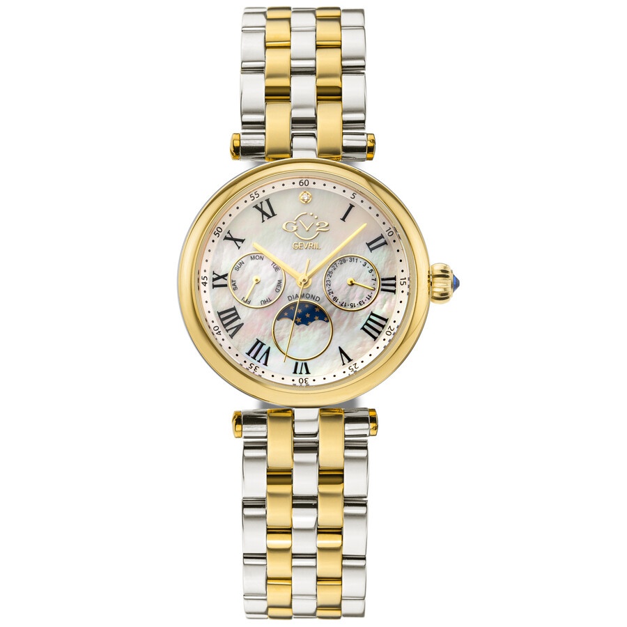 Gold-tone stainless steel case with a two-tone (silver-tone and gold-tone) stainless steel bracelet. Fixed gold-tone stainless steel bezel. Mother of pearl dial with gold-tone hands and Roman numeral & diamond hour markers. Minute markers around the outer rim. Dial Type: Analog. Date display at the 3 o'clock position. Three - day, date, moon phase subdials. Quartz movement. Scratch resistant sapphire crystal. Pull / push crown. Solid case back. Round case shape. Case size: 36 mm. Band width: 18 mm. Deployment with push button release clasp. Water resistant at 50 meters / 165 feet. Functions: date, day, hour, minute, second, moon phase. Fashion watch style. Watch label: Swiss Made. GV2 by Gevril Florence Quartz Diamond Ladies Watch 12505B. INFORMATION Brand: Gv2 By Gevril Series: Florence Collection Name: Florence Gender: Womens Model: 12505B Watch Label: Swiss Made Movement: Quartz CASE Case Size: 36 mm Case Material: Stainless Steel Case Shape: Round Case Back: Solid BAND Band Material: Stainless Steel Band Type: Bracelet Band Color: Two-tone (Silver-tone and Gold-tone) Band Width: 18 mm Clasp: Deployment with Push Button Release DIAL Dial Color: Mother of Pearl Type: Analog Crystal: Scratch Resistant Sapphire Hands: Gold-tone Dial Markers: Roman Numeral & Diamond Second Markers: Minute Markers around the outer rim Sub Dials: Three - Date, Day and Moon phase Bezel: Fixed Bezel Color: Gold-tone Bezel Material: Stainless Steel Crown: Pull / Push FEATURES Water Resistance: 50 meters / 165 feet Calendar: Date display at the 3 o'clock position Functions: Date, Day, Hour, Minute, Second, Moon Phase Watch Features: Diamond, Moon Phase, Stainless Steel, Gold, Analog ADDITIONAL INFO Watch Style: Fashion UPC Code: 840840119469 Jomashop Sku: GER12505B Department: Watches Category: Watches