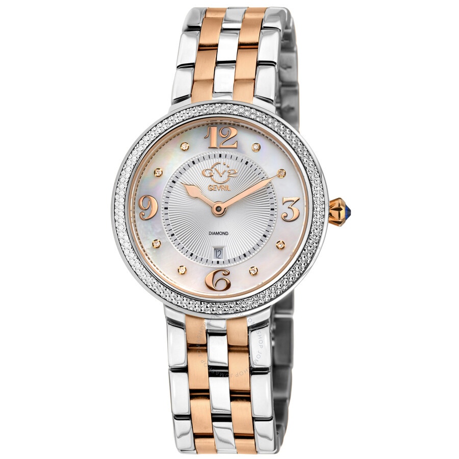 Silver-tone stainless steel case with a two-tone (silver-tone and rose gold-tone) stainless steel bracelet. Fixed silver-tone stainless steel bezel. Mother of pearl dial with rose gold-tone hands and diamond hour markers. Minute scale around the inner rim. Dial Type: Analog. Date display at the 6 o'clock position. Ronda Caliber 784 quartz movement. Scratch resistant sapphire crystal. Pull / push crown. Solid case back. Round case shape, case size: 37 mm, case thickness: 9 mm. Band width: 18 mm. Deployment with push button release clasp. Water resistant at 50 meters / 165 feet. Functions: date, hour, minute. Verona Series. Fashion watch style. Watch label: Swiss Movt. GV2 by Gevril Verona Diamond Mother of Pearl Dial Ladies Watch 12904B. INFORMATION Brand: Gv2 By Gevril Series: Verona Collection Name: Verona Gender: Womens Model: 12904B Watch Label: Swiss Movt Movement: Quartz Engine: Ronda Caliber 784 CASE Case Size: 37 mm Case Thickness: 9 mm Case Material: Stainless Steel Case Shape: Round Case Back: Solid BAND Band Material: Stainless Steel Band Type: Bracelet Band Color: Two-tone (Silver-tone and Rose Gold-tone) Band Width: 18 mm Clasp: Deployment with Push Button Release DIAL Dial Color: Mother of Pearl Type: Analog Crystal: Scratch Resistant Sapphire Hands: Rose Gold-tone Dial Markers: Diamond Second Markers: Minute Scale around the inner rim Bezel: Fixed Bezel Color: Silver-tone Bezel Material: Stainless Steel Crown: Pull / Push FEATURES Water Resistance: 50 meters / 165 feet Calendar: Date display at the 6 o'clock position Functions: Date, Hour, Minute Watch Features: Diamond, Stainless Steel, Gold, Analog ADDITIONAL INFO Watch Style: Fashion Warranty: With Manufacturers Guarantee UPC Code: 840840125347 Jomashop Sku: Y-161954 Department: Watches Category: Watches