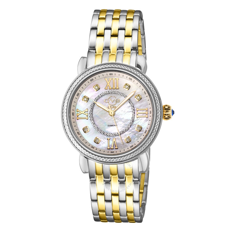 Stainless steel case with a two-tone (silver-tone and yellow gold-tone) stainless steel bracelet. Fixed (diamond-cut) stainless steel bezel. Mother of pearl dial with luminous yellow gold-tone hands and diamond hour markers. Roman numerals appear at the 3, 6, 9 and 12 o'clock positions. Arabic numeral minute markers (at 5 minute intervals). Minute markers around the outer rim. Dial Type: Analog. Luminescent hands. Quartz movement. Scratch resistant sapphire crystal. Pull / push crown. Solid case back. Round case shape. Case size: 37 mm. Case thickness: 9 mm. Band width: 18 mm. Deployment clasp with a push button release. Water resistant at 50 meters / 165 feet. Functions: hour, minute, second. Additional Info: 8 diamonds. Marsala Series. Fashion watch style. GV2 by Gevril Marsala Diamond Mother of Pearl Dial Ladies Watch 9864B. INFORMATION Brand: Gv2 By Gevril Series: Marsala Collection Name: Marsala Gender: Womens Model: 9864B Movement: Quartz CASE Case Size: 37 mm Case Thickness: 9 mm Case Material: Stainless Steel Case Shape: Round Case Back: Solid BAND Band Material: Stainless Steel Band Type: Bracelet Band Color: Two-tone (Silver-tone and Yellow Gold-tone) Band Width: 18 mm Clasp: Deployment with Push Button Release DIAL Dial Color: Mother of Pearl Type: Analog Crystal: Scratch Resistant Sapphire Hands: Luminous Yellow Gold-tone Dial Markers: Diamond Second Markers: Roman Numerals appear at the 3, 6, 9 and 12 o'clock positions. Arabic Numeral Minute Markers (at 5 minute intervals). Minute Markers around the outer rim Luminiscence: Hands Bezel: Fixed (Diamond-Cut) Bezel Color: Silver-tone Bezel Material: Stainless Steel Crown: Pull / Push FEATURES Water Resistance: 50 meters / 165 feet Functions: Hour, Minute, Second Watch Features: Diamond, Stainless Steel, Gold, Analog ADDITIONAL INFO Watch Style: Fashion Warranty: With Manufacturers Guarantee UPC Code: 840840127006 Additional Info: 8 Diamonds Jomashop Sku: Y-165741 Department: Watches Category: Watches
