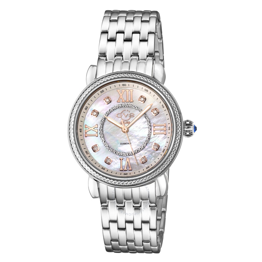 Silver-tone stainless steel case and bracelet. Fixed silver-tone stainless steel bezel. Mother of pearl dial with rose gold-tone hands and diamond hour markers. Minute markers around the outer rim. Dial Type: Analog. Luminescent hands. Quartz movement. Scratch resistant sapphire crystal. Pull / push crown. Solid case back. Round case shape, case size: 37 mm, case thickness: 9 mm. Band width: 18 mm. Deployment with push button release clasp. Water resistant at 50 meters / 165 feet. Functions: hour, minute, second. Additional Info: 8 diamonds. Marsala Series. Fashion watch style. GV2 by Gevril Marsala Quartz Diamond Ladies Watch 9860B. INFORMATION Brand: Gv2 By Gevril Series: Marsala Collection Name: Marsala Gender: Womens Model: 9860B Watch Label: Swiss Movt Movement: Quartz Engine: Ronda Caliber 763 CASE Case Size: 37 mm Case Thickness: 9 mm Case Material: Stainless Steel Case Shape: Round Case Back: Solid BAND Band Material: Stainless Steel Band Type: Bracelet Band Color: Silver-tone Band Width: 18 mm Clasp: Deployment with Push Button Release DIAL Dial Color: Mother of Pearl Type: Analog Crystal: Scratch Resistant Sapphire Hands: Rose Gold-tone Dial Markers: Diamond Second Markers: Minute Markers around the outer rim Luminiscence: Hands Bezel: Fixed Bezel Color: Silver-tone Bezel Material: Stainless Steel Crown: Pull / Push FEATURES Water Resistance: 50 meters / 165 feet Functions: Hour, Minute, Second Watch Features: Diamond, Stainless Steel, Gold, Analog ADDITIONAL INFO Watch Style: Fashion Warranty: With Manufacturers Guarantee UPC Code: 840840126962 Additional Info: 8 Diamonds Jomashop Sku: Y-165744 Department: Watches Category: Watches