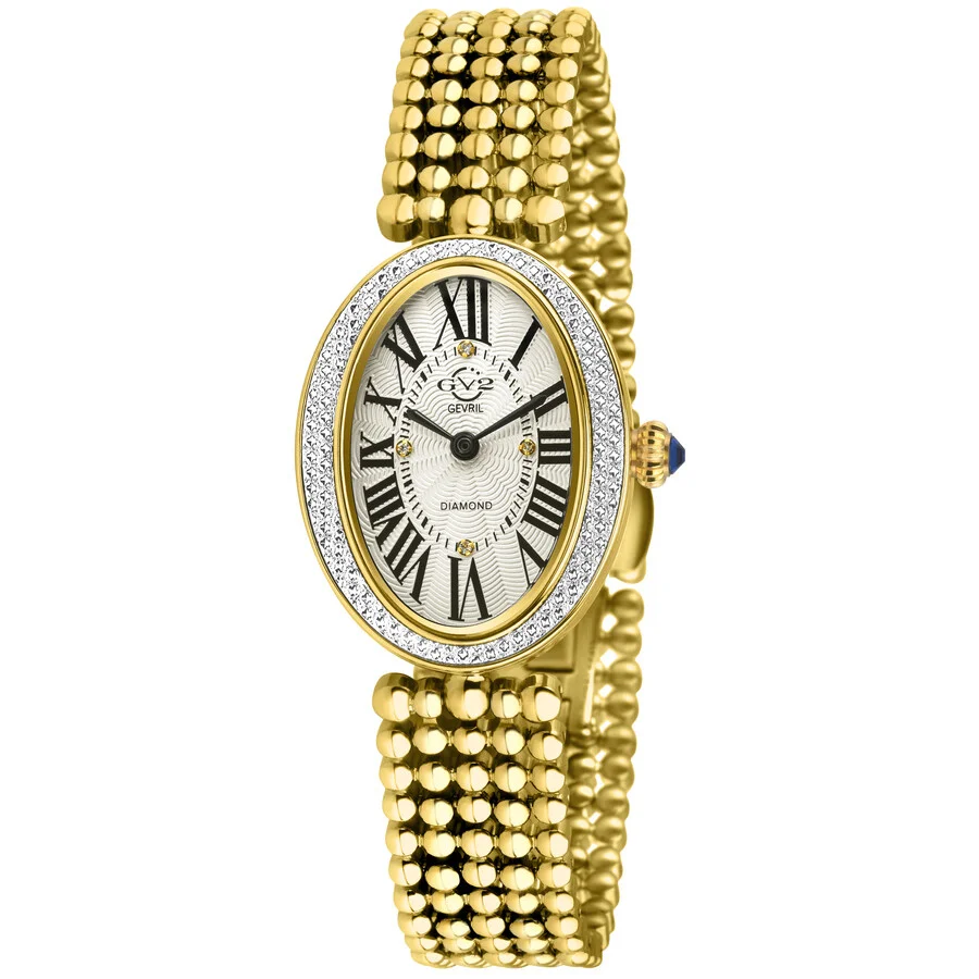 Yellow gold-tone stainless steel case and bracelet. Fixed yellow gold-tone stainless steel bezel. White dial with black hands and Roman numeral hour markers. Minute scale around the inner rim. Dial Type: Analog. Ronda Caliber 1062 quartz movement. Scratch resistant sapphire crystal. Pull / push crown. Solid case back. Oval case shape, case size: 24.5 mm, case thickness: 7 mm. Band width: 14 mm. Deployment with push button release clasp. Water resistant at 50 meters / 165 feet. Functions: hour, minute. Additional Info: diamonds. Piazza Navona Series. Fashion watch style. Watch label: Swiss Movt. GV2 by Gevril Piazza Navona Quartz White Dial Ladies Watch 14811B. GENERAL Box Type: Original Box CASE Case Thickness: 7 mm Case Material: Stainless Steel Case Shape: Oval Case Back: Solid BAND Band Material: Stainless Steel Band Type: Bracelet Band Color: Yellow Gold-tone Band Width: 14 mm Clasp: Deployment with Push Button Release DIAL Dial Color: White Type: Analog Crystal: Scratch Resistant Sapphire Hands: Black Dial Markers: Roman Numeral Second Markers: Minute Scale around the inner rim Bezel: Fixed Bezel Color: Yellow Gold-tone Bezel Material: Stainless Steel Crown: Pull / Push INFORMATION Brand: Gv2 By Gevril Series: Piazza Navona Collection Name: Piazza Navona Gender: Womens Model: 14811B Watch Label: Swiss Movt Movement: Quartz Engine: Ronda Caliber 1062 FEATURES Water Resistance: 50 meters / 165 feet Functions: Hour, Minute Watch Features: Analog, Gold, Stainless Steel, Diamond ADDITIONAL INFO Watch Style: Fashion Warranty: With Manufacturers Guarantee UPC Code: 840840151001 Additional Info: Diamonds Jomashop Sku: Y-A5VUV Department: Watches