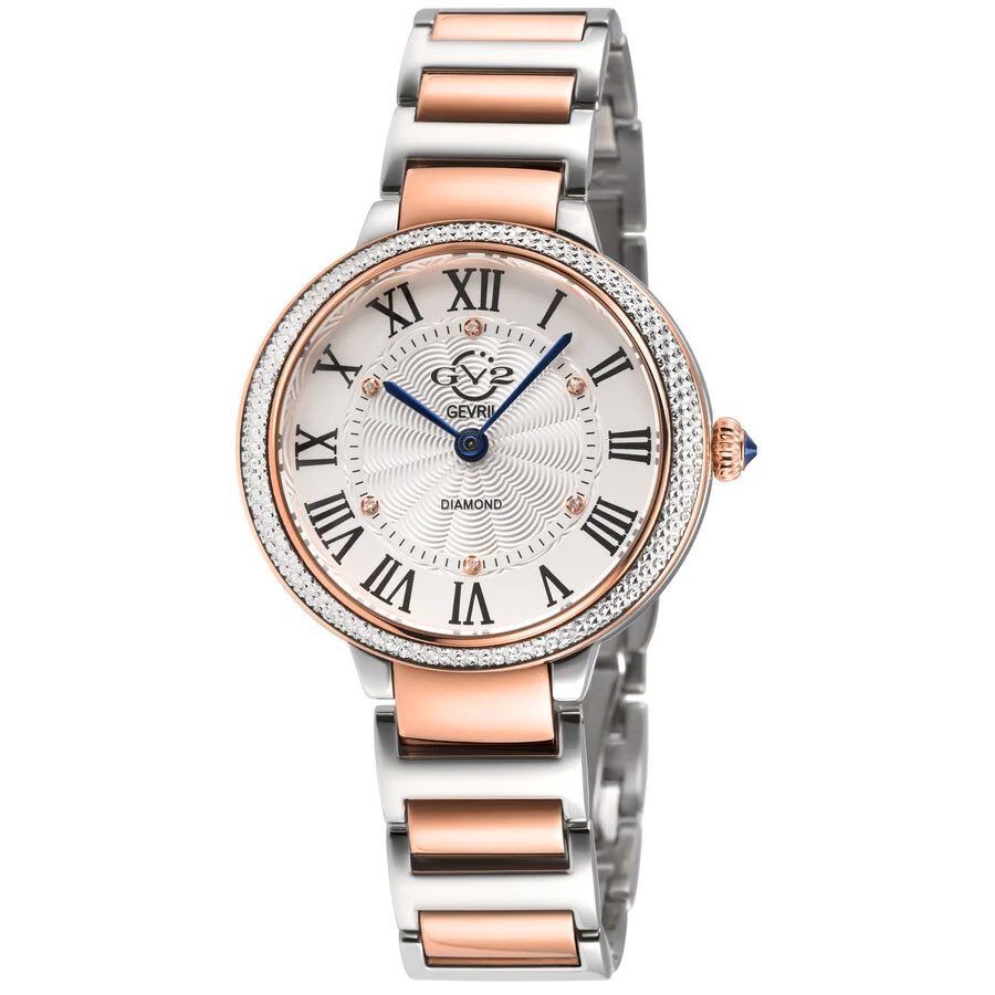 Silver-tone stainless steel case with a two-tone (silver-tone and rose gold-tone) stainless steel bracelet. Fixed rose gold-tone stainless steel bezel. White dial with blue hands and Roman numeral hour markers. Minute scale around the inner rim. Dial Type: Analog. Ronda Caliber 762 quartz movement. Scratch resistant sapphire crystal. Pull / push crown. Solid case back. Round case shape, case size: 36 mm, case thickness: 10 mm. Band width: 16 mm. Deployment with push button release clasp. Water resistant at 50 meters / 165 feet. Functions: hour, minute. Additional Info: diamonds. Rome Brillante Series. Fashion watch style. Watch label: Swiss Movt. GV2 by Gevril Rome Brillante Quartz White Dial Ladies Watch 122104B. GENERAL Box Type: Original Box CASE Case Thickness: 10 mm Case Material: Stainless Steel Case Shape: Round Case Back: Solid BAND Band Material: Stainless Steel Band Type: Bracelet Band Color: Two-tone (Silver-tone and Rose Gold-tone) Band Width: 16 mm Clasp: Deployment with Push Button Release DIAL Dial Color: White Type: Analog Crystal: Scratch Resistant Sapphire Hands: Blue Dial Markers: Roman Numeral Second Markers: Minute Scale around the inner rim Bezel: Fixed Bezel Color: Rose Gold-tone Bezel Material: Stainless Steel Crown: Pull / Push INFORMATION Brand: Gv2 By Gevril Series: Rome Brillante Collection Name: Rome Brillante Gender: Womens Model: 122104B Watch Label: Swiss Movt Movement: Quartz Engine: Ronda Caliber 762 FEATURES Water Resistance: 50 meters / 165 feet Functions: Hour, Minute Watch Features: Analog, Gold, Stainless Steel, Diamond ADDITIONAL INFO Watch Style: Fashion Warranty: With Manufacturers Guarantee UPC Code: 840840150202 Additional Info: Diamonds Jomashop Sku: Y-A5VVC Department: Watches