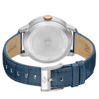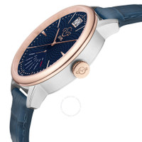 Silver-tone stainless steel case with a blue genuine leather strap. Fixed rose gold-tone stainless steel bezel. Blue dial with rose gold-tone hands and index hour markers. Minute markers around the outer rim. Dial Type: Analog. Date display at the 12 o'clock position. Ronda Caliber 7003.L quartz movement. Scratch resistant sapphire crystal. Pull / push crown. Solid case back. Round case shape, case size: 42 mm, case thickness: 13 mm. Band width: 18 mm. Buckle clasp. Water resistant at 50 meters / 165 feet. Functions: date, day, hour, minute, second. Additional Info: day indicator, large date window at 12 o'clock. Rovescio Series. Luxury watch style. Watch label: Swiss Made. GV2 by Gevril Rovescio Blue Dial Men's Watch 56205. INFORMATION Brand: Gv2 By Gevril Series: Rovescio Collection Name: Rovescio Gender: Mens Model: 56205 Watch Label: Swiss Made Movement: Quartz Engine: Ronda Caliber 7003.L CASE Case Size: 42 mm Case Thickness: 13 mm Case Material: Stainless Steel Case Shape: Round Case Back: Solid BAND Band Material: Genuine Leather Band Type: Strap Band Color: Blue Band Width: 18 mm Clasp: Buckle DIAL Dial Color: Blue Type: Analog Crystal: Scratch Resistant Sapphire Hands: Rose Gold-tone Dial Markers: Index Second Markers: Minute Markers around the outer rim Bezel: Fixed Bezel Color: Rose Gold-tone Bezel Material: Stainless Steel Crown: Pull / Push FEATURES Water Resistance: 50 meters / 165 feet Calendar: Date display at the 12 o'clock position Functions: Date, Day, Hour, Minute, Second Watch Features: Stainless Steel, Leather, Gold, Analog ADDITIONAL INFO Watch Style: Luxury Warranty: With Manufacturers Guarantee UPC Code: 840840126238 Additional Info: Day indicator, large date window at 12 o'clock Jomashop Sku: Y-166545 Department: Watches Category: Watches