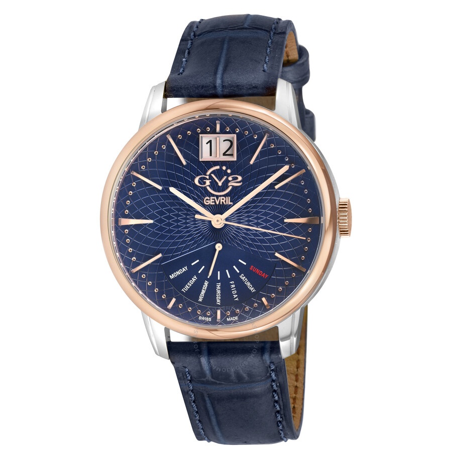 Silver-tone stainless steel case with a blue leather strap. Fixed rose gold-tone stainless steel bezel. Black dial with rose gold-tone hands and index hour markers. Minute markers around the outer rim. Dial Type: Analog. Day / date. One subdial displaying: retrograde day. Ronda Caliber 7003.L quartz movement. Scratch resistant sapphire crystal. Pull / push crown. Solid case back. Round case shape, case size: 42 mm, case thickness: 13 mm. Band width: 20 mm. Buckle clasp. Water resistant at 50 meters / 165 feet. Functions: retrograde, big date, day, hour, minute, second. Rovescio Series. Fashion watch style. Watch label: Swiss Made. GV2 by Gevril Rovescio Quartz Black Dial Men's Watch 56215. GENERAL Box Type: Original Box CASE Case Size: 42 Case Thickness: 13 mm Case Material: Stainless Steel Case Shape: Round Case Back: Solid BAND Band Material: Leather Band Type: Strap Band Color: Blue Band Width: 20 mm Clasp: Buckle DIAL Dial Color: Black Type: Analog Crystal: Scratch Resistant Sapphire Hands: Rose Gold-tone Dial Markers: Index Second Markers: Minute Markers around the outer rim Sub Dials: One - Retrograde Day Bezel: Fixed Bezel Color: Rose Gold-tone Bezel Material: Stainless Steel Crown: Pull / Push INFORMATION Brand: Gv2 By Gevril Series: Rovescio Collection Name: Rovescio Gender: Mens Model: 56215 Watch Label: Swiss Made Movement: Quartz Engine: Ronda Caliber 7003.L FEATURES Water Resistance: 50 meters / 165 feet Calendar: Day / Date Functions: Retrograde, Big Date, Day, Hour, Minute, Second Watch Features: Analog, Retrograde, Gold, Leather, Stainless Steel ADDITIONAL INFO Watch Style: Fashion Warranty: https://www.gevril.com/pages/watch-repair-shop-and UPC Code: 840840146137 Jomashop Sku: Y-A4GXN Department: Watches