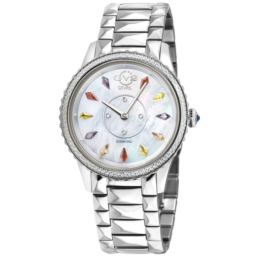 Silver-tone stainless steel case and bracelet. Fixed silver-tone stainless steel bezel. Mother of pearl dial with silver-tone hands and index hour markers. Dial Type: Analog. Ronda Caliber 762 quartz movement. Scratch resistant sapphire crystal. Pull / push crown. Solid case back. Round case shape, case size: 36 mm, case thickness: 8 mm. Band width: 18 mm. Deployment with push button release clasp. Water resistant at 50 meters / 165 feet. Functions: hour, minute. Siena Series. Fashion watch style. Watch label: Swiss Movt. GV2 by Gevril Siena Mother of Pearl Dial Ladies Watch 11734B. INFORMATION Brand: Gv2 By Gevril Series: Siena Collection Name: Siena Gender: Womens Model: 11734B Watch Label: Swiss Movt Movement: Quartz Engine: Ronda Caliber 762 CASE Case Size: 36 mm Case Thickness: 8 mm Case Material: Stainless Steel Case Shape: Round Case Back: Solid BAND Band Material: Stainless Steel Band Type: Bracelet Band Color: Silver-tone Band Width: 18 mm Clasp: Deployment with Push Button Release DIAL Dial Color: Mother of Pearl Type: Analog Crystal: Scratch Resistant Sapphire Hands: Silver-tone Dial Markers: Index Bezel: Fixed Bezel Color: Silver-tone Bezel Material: Stainless Steel Crown: Pull / Push FEATURES Water Resistance: 50 meters / 165 feet Functions: Hour, Minute Watch Features: Stainless Steel, Analog ADDITIONAL INFO Watch Style: Fashion Warranty: With Manufacturers Guarantee UPC Code: 840840145857 Jomashop Sku: Y-A4HEL Department: Watches