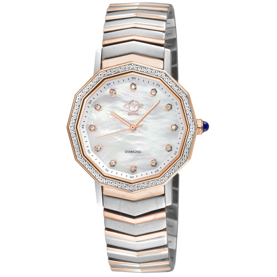 Rose gold-tone stainless steel case with a two-tone (silver-tone and rose gold-tone) stainless steel bracelet. Fixed rose gold-tone stainless steel bezel. Mother of pearl dial with rose gold-tone hands and diamond hour markers. Minute markers around the outer rim. Dial Type: Analog. Ronda Caliber 763 quartz movement. Scratch resistant sapphire crystal. Pull / push crown. Solid case back. Dodecagon case shape, case size: 36 mm, case thickness: 8 mm. Band width: 18 mm, band length: 7.5 inches. Deployment with push button release clasp. Water resistant at 30 meters / 100 feet. Functions: hour, minute, second. Spello II Series. Fashion watch style. Watch label: Swiss Movt. GV2 by Gevril Spello Ii Diamond Mother of Pearl Dial Ladies Watch 14519B. GENERAL Box Type: Original Box CASE Case Diameter: 36 Case Thickness: 8 mm Case Material: Stainless Steel Case Shape: Dodecagon Case Back: Solid BAND Band Material: Stainless Steel Band Type: Bracelet Band Color: Two-tone (Silver-tone and Rose Gold-tone) Band Length: 7.5 inches Band Width: 18 mm Clasp: Deployment with Push Button Release DIAL Dial Color: Mother of Pearl Type: Analog Crystal: Scratch Resistant Sapphire Hands: Rose Gold-tone Dial Markers: Diamond Second Markers: Minute Markers around the outer rim Bezel: Fixed Bezel Color: Rose Gold-tone Bezel Material: Stainless Steel Crown: Pull / Push INFORMATION Brand: Gv2 By Gevril Series: Spello Ii Collection Name: Spello Ii Gender: Womens Model: 14519B Watch Label: Swiss Movt Movement: Quartz Engine: Ronda Caliber 763 FEATURES Water Resistance: 30 meters / 100 feet Functions: Hour, Minute, Second Watch Features: Analog, Gold, Stainless Steel, Diamond ADDITIONAL INFO Watch Style: Fashion Warranty: With Manufacturers Guarantee UPC Code: 840840148193 Jomashop Sku: Y-A55L7 Department: Watches
