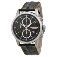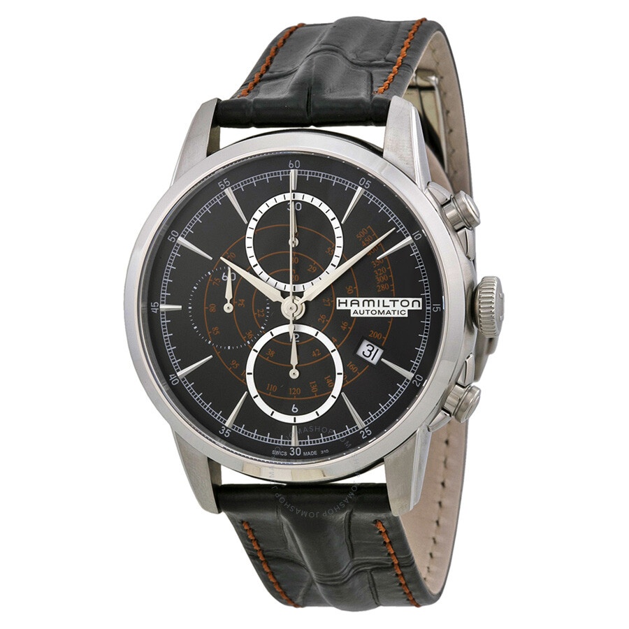 Silver-tone stainless steel case with a black alligator leather strap. Fixed silver-tone stainless steel bezel. Black dial with silver-tone alpha-style shape hands and index hour markers. Tachymeter markings. minute markers around the outer rim. Dial Type: Analog. Luminescent hands and markers. Date display at the 4 o'clock position. Chronograph - three sub-dials displaying: 60 second, 30 minute and 12 hour. Hamilton Calibre H-21 Automatic movement, based upon ETA 7750, containing 25 Jewels, bitting at 28800 vph, and has a power reserve of approximately 60 hours. Scratch resistant sapphire crystal. Skeleton case back. Round case shape. Case size: 44 mm. Band width: 22 mm. Deployment clasp. Water resistant at 50 meters / 165 feet. Functions: chronograph,tachymeter, date, hour, minute, second. Dress watch style. Watch label: Swiss Made. Hamilton American Classic Automatic Chronograph Men's Watch H40656731. CASE Case Size: 44 Case Material: Stainless Steel Case Shape: Round Case Back: Skeleton BAND Band Material: Alligator Leather Band Type: Strap Band Color: Black Band Width: 22 mm Clasp: Deployment DIAL Dial Color: Black Type: Analog Crystal: Scratch Resistant Sapphire Hands: Silver-tone Alpha-style shape Dial Markers: Index Second Markers: Tachymeter Markings. Minute Markers around the outer rim Sub Dials: Three - 60 Second, 30 Minute and 12 Hour Luminiscence: Hands and Markers Bezel: Fixed Bezel Color: Silver-tone Bezel Material: Stainless Steel INFORMATION Brand: Hamilton Series: American Classic Collection Name: American Classic Gender: Mens Model: H40656731 Watch Label: Swiss Made Movement: Automatic Engine: Hamilton Calibre H-21 Power Reserve: 60 hours FEATURES Water Resistance: 50 meters / 165 feet Calendar: Date display at the 4 o'clock position Functions: Chronograph,Tachymeter, Date, Hour, Minute, Second Watch Features: Alligator Leather, Analog, Leather, Stainless Steel, Chronograph ADDITIONAL INFO Watch Style: Dress Warranty: 2 Year Jomashop Warranty UPC Code: 7640127758663 Jomashop Sku: HML-H40656731 Department: Watches Category: Watches