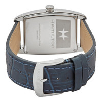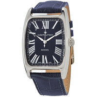 Stainless steel case with a blue leather strap. Fixed stainless steel bezel. Blue dial with silver-tone alpha-style hands and Roman numeral hour markers. Minute markers around the outer rim. Dial Type: Analog. Hamilton calibre H-50 hand wind movement, based upon ETA 2801-2, containing 17 Jewels, bitting at 21600 vph, and has a power reserve of approximately 80 hours. Scratch resistant sapphire crystal. Pull / push crown. Solid case back. Tonneau case shape. Case dimensions: 34.5 mm x 38 mm. Case thickness: 11.2 mm. Band width: 22 mm. Tang clasp. Water resistant at 50 meters / 165 feet. Functions: hour, minute, second. Boulton Series. Dress watch style. Watch label: Swiss Made. Hamilton Boulton Hand Wind Blue Dial Men's Watch H13519641. GENERAL Box Type: Original Box CASE Case Size: 38 Case Thickness: 11.2 mm Case Material: Stainless Steel Case Shape: Tonneau Case Back: Solid BAND Band Material: Leather Band Type: Strap Band Color: Blue Band Width: 22 mm Clasp: Tang DIAL Dial Color: Blue Type: Analog Crystal: Scratch Resistant Sapphire Hands: Silver-tone Alpha-style Dial Markers: Roman Numeral Second Markers: Minute Markers around the outer rim Bezel: Fixed Bezel Color: Silver-tone Bezel Material: Stainless Steel Crown: Pull / Push INFORMATION Brand: Hamilton Series: American Classic Collection Name: Boulton Gender: Mens Model: H13519641 Watch Label: Swiss Made Movement: Hand Wind Engine: Hamilton Calibre H-50 Power Reserve: 80 hours FEATURES Water Resistance: 50 meters / 165 feet Functions: Hour, Minute, Second Watch Features: Analog, Leather, Stainless Steel ADDITIONAL INFO Watch Style: Dress Warranty: 2 Year Jomashop Warranty UPC Code: 7640167049530 Jomashop Sku: HML-H13519641 Department: Watches Category: Watches