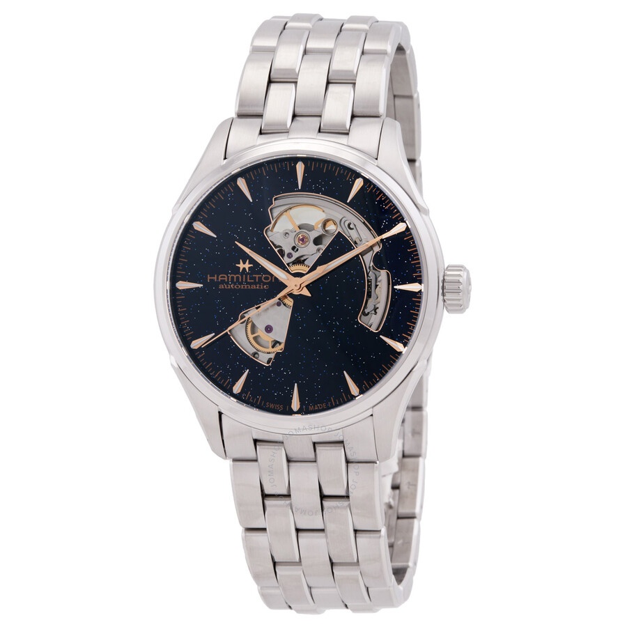 Silver-tone stainless steel case and bracelet. Fixed silver-tone stainless steel bezel. Blue dial with gold-tone hands and index hour markers. Minute markers around the outer rim. Dial Type: Analog. Luminescent hands and markers. Hamilton Calibre H-10 Automatic movement, based upon ETA C07.111, containing 25 Jewels, bitting at 21600 vph, and has a power reserve of approximately 80 hours. Scratch resistant sapphire crystal. Pull / push crown. Transparent see through case back. Round case shape, case size: 42 mm, case thickness: 11.44 mm. Band width: 22 mm. Fold over clasp with a safety release. Water resistant at 50 meters / 165 feet. Functions: hour, minute, second. Jazzmaster Series. Sport watch style. Watch label: Swiss Made. Hamilton Jazzmaster Automatic Blue Dial Men's Watch H32705140. GENERAL Box Type: Original Box CASE Case Diameter: 42 mm Case Thickness: 11.44 mm Case Material: Stainless Steel Case Shape: Round Case Back: Transparent See Through BAND Band Material: Stainless Steel Band Type: Bracelet Band Color: Silver-tone Band Width: 22 mm Clasp: Fold Over with Safety Release DIAL Dial Color: Blue Type: Analog Crystal: Scratch Resistant Sapphire Hands: Gold-tone Dial Markers: Index Second Markers: Minute Markers around the outer rim Luminiscence: Hands and Markers Bezel: Fixed Bezel Color: Silver-tone Bezel Material: Stainless Steel Crown: Pull / Push INFORMATION Brand: Hamilton Series: Jazzmaster Collection Name: Jazzmaster Gender: Mens Model: H32705140 Watch Label: Swiss Made Movement: Automatic Engine: Hamilton Calibre H-10 Power Reserve: 80 hours FEATURES Water Resistance: 50 meters / 165 feet Functions: Hour, Minute, Second Watch Features: Analog, Gold, Stainless Steel ADDITIONAL INFO Watch Style: Sport Warranty: 2 Year Jomashop Warranty Jomashop Sku: HML-H32705140 Department: Watches