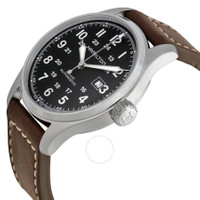 Stainless steel case with a brown leather strap. Fixed stainless steel bezel. Black dial with luminous hands and Arabic numeral hour markers. 24 hour markers around an inner ring. Minute markers around the outer rim. Dial Type: Analog. Luminescent hands and markers. Date display at the 3 o'clock position. Hamilton calibre H-10 automatic movement, based upon ETA C07.111, containing 25 Jewels, bitting at 21600 vph, and has a power reserve of approximately 80 hours. Scratch resistant sapphire crystal. Skeleton case back. Round case shape. Case size: 44.5 mm. Case thickness: 11 mm. Band width: 22 mm. Band length: 8.5 inches. Tang clasp. Water resistant at 100 meters / 330 feet. Functions: date, hour, minute, second. Casual watch style. Watch label: Swiss Made. Hamilton Khaki Officers Automatic Black Dial Men's Watch H70625533. GENERAL Box Type: Original Box Color: Black / Skeleton CASE Case Size: 44 Case Thickness: 11 mm Case Material: Stainless Steel Case Shape: Round Case Back: Skeleton BAND Band Material: Leather Band Type: Strap Band Color: Brown Band Length: 8.5 inches Band Width: 22 mm Clasp: Tang DIAL Dial Color: Black Type: Analog Crystal: Scratch Resistant Sapphire Hands: Luminous Dial Markers: Arabic Numeral Second Markers: 24 Hour Markers around the inner ring. Minute Markers around the outer rim Luminiscence: Hands and Markers Bezel: Fixed Bezel Color: Silver-tone Bezel Material: Stainless Steel INFORMATION Brand: Hamilton Series: Khaki Field Collection Name: Khaki Officer Gender: Mens Model: H70625533 Watch Label: Swiss Made Movement: Automatic Engine: Hamilton Calibre H-10 Power Reserve: 80 hours FEATURES Water Resistance: 100 meters / 330 feet Calendar: Date display at the 3 o'clock position Functions: Date, Hour, Minute, Second Watch Features: Analog, Leather, Stainless Steel ADDITIONAL INFO Watch Style: Casual Warranty: 2 Year Jomashop Warranty UPC Code: 7640127752159 Jomashop Sku: HML-H70625533 Department: Watches Category: Watches
