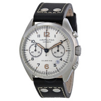 Stainless steel case with a black leather strap. Fixed stainless steel bezel. Ivory dial with luminous hands and Arabic numeral hour markers. Minute markers around the outer rim. Dial Type: Analog. Luminescent hands and markers. Date display between the 4 and 5 o'clock positions. Chronograph - two sub-dials displaying: 60 second and 30 minute. Hamilton calibre H-31 automatic movement with a 60-hour power reserve. Scratch resistant sapphire crystal. Screw locked crown. Skeleton case back. Case diameter: 41 mm. Case thickness: 17 mm. Round case shape. Band width: 22 mm. Tang clasp. Water resistant at 100 meters / 330 feet. Functions: chronograph, date, hour, minute, second. Casual watch style. Hamilton Khaki Pilot Pioneer Automatic Chronograph Ivory Dial Black Leather Men's Watch H76416755. CASE Case Size: 41 Case Thickness: 17 mm Case Material: Stainless Steel Case Shape: Round Case Back: Transparent BAND Band Material: Leather Band Type: Strap Band Color: Black Band Length: 7.5 inches Band Width: 22 mm Clasp: Tang DIAL Dial Color: Ivory Type: Analog Crystal: Scratch Resistant Sapphire Hands: Luminous Dial Markers: Arabic Numeral Second Markers: Minute Markers around the outer rim Sub Dials: Two - 60 Second and 30 Minute Luminiscence: Hands and Markers Bezel: Fixed Bezel Color: Silver-tone Bezel Material: Stainless Steel Crown: Screw Down INFORMATION Brand: Hamilton Series: Khaki Pilot Pioneer Collection Name: Khaki Pilot Pioneer Gender: Mens Model: H76416755 Watch Label: Swiss Made Movement: Automatic Engine: Hamilton Calibre H-31 Power Reserve: 60 hours FEATURES Water Resistance: 100 meters / 330 feet Calendar: Date display between 4 and 5 o'clock position Functions: Chronograph, Date, Hour, Minute, Second Watch Features: Analog, Leather, Stainless Steel, Chronograph ADDITIONAL INFO Watch Style: Pilot Warranty: 2 Year Jomashop Warranty UPC Code: 7640127757345 Jomashop Sku: HML-H76416755 Department: Watches Category: Watches