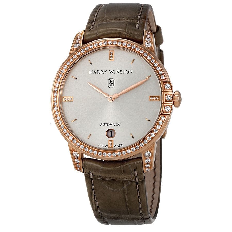 Rose gold 18kt case with a taupe alligator bracelet. Fixed rose gold 18kt gold and diamonds bezel. Silver-tone sunburst dial with rose gold hands and index with diamond hour markers. Dial Type: Analog. Date display at the 6 o'clock position. Harry Winston Calibre HW2007 automatic movement with a 72-hour power reserve. Scratch resistant sapphire crystal. Skeleton transparent exhibition see through case back. Case size: 36 mm. Round case shape. Buckle clasp. Water resistant at 30 meters / 100 feet. Functions: date, hour, minute, second. Additional Info: 95 brilliant-cut diamonds (0.93ct). Luxury watch style. Watch label: Swiss Made. Harry Winston Midnight Automatic 36mm Rose Gold Diamond Men's Watch MIDAHD36RR001. GENERAL Box Type: Original Box CASE Case Size: 36 Case Material: 18kt Case Shape: Round Case Back: Skeleton Transparent Exhibition See Through BAND Band Material: Alligator Leather Band Type: Strap Band Color: Taupe Clasp: Buckle DIAL Dial Color: Silver-tone sunburst Type: Analog Crystal: Scratch Resistant Sapphire Hands: Rose Gold Dial Markers: Index with Diamond Bezel: Fixed Bezel Color: Rose Gold Bezel Material: 18kt Gold and Diamonds INFORMATION Brand: Harry Winston Series: Midnight Collection Name: Midnight Gender: Mens Model: MIDAHD36RR001 Watch Label: Swiss Made Movement: Automatic Engine: Harry Winston Calibre HW2007 Power Reserve: 72 hours FEATURES Water Resistance: 30 meters / 100 feet Calendar: Date display at the 6 o'clock position Functions: Date, Hour, Minute, Second Watch Features: Alligator Leather, Analog, Gold, Diamond ADDITIONAL INFO Watch Style: Luxury Warranty: 2 Year Jomashop Warranty Additional Info: 95 brilliant-cut diamonds (0.93ct) Jomashop Sku: HWMIDAHD36RR001 Department: Watches Category: Watches