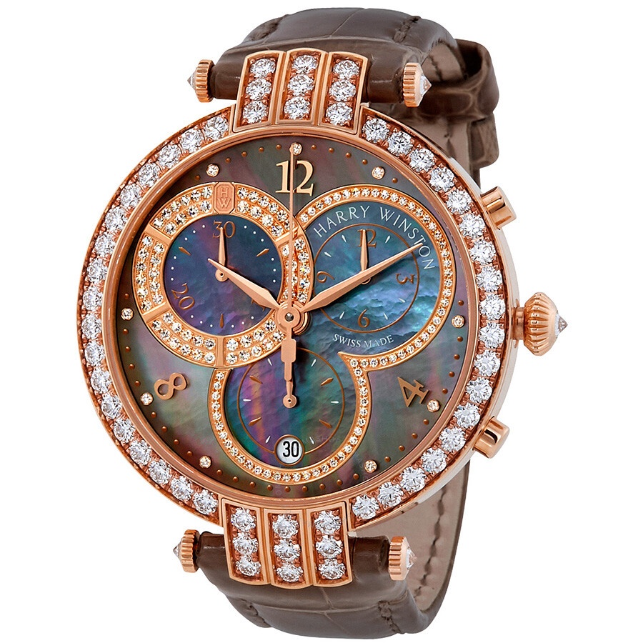 Rose gold-tone 18 carat rose gold case with a taupe alligator leather strap. Fixed-diamond set rose gold-tone 18 carat rose gold bezel. Tahitian mother of pearl dial with rose gold-tone hands and Arabic-diamond numeral hour markers. Dial Type: Analog. Date display at the 6 o'clock position. Chronograph - three sub-dials displaying: 60 second, 30 minute and 12 hours. Harry Winston Calibre HW5202 quartz movement. Scratch resistant sapphire crystal. Case size: 40 mm. Round case shape. Water resistant at 30 meters / 100 feet. Functions: chronograph, date, hour, minute, second. Additional Info: watch set with 236 diamonds (~3.47 carats). Luxury watch style. Watch label: Swiss Made. Harry Winston Premier Men's Chronograph Watch PRNQCH40RR002. GENERAL Box Type: Original Box CASE Case Size: 40 Case Material: 18kt Rose Gold Case Shape: Round BAND Band Material: Alligator Leather Band Type: Strap Band Color: Taupe DIAL Dial Color: Tahitian Mother Of Pearl Type: Analog Crystal: Scratch Resistant Sapphire Hands: Rose Gold-tone Dial Markers: Arabic-Diamond Numeral Sub Dials: Three - 60 Second, 30 Minute and 12 Hour Bezel: Fixed Bezel Color: 18kt Rose Gold Bezel Material: Diamond Set INFORMATION Brand: Harry Winston Series: Premier Collection Name: Premier Gender: Mens Model: PRNQCH40RR002 Watch Label: Swiss Made Movement: Quartz Engine: Harry Winston Calibre HW5202 FEATURES Water Resistance: 30 meters / 100 feet Calendar: Date display at the 6 o'clock position Functions: Chronograph, Date, Hour, Minute, Second Watch Features: Alligator Leather, Analog, Gold, Leather, Chronograph, Diamond ADDITIONAL INFO Watch Style: Luxury Warranty: 2 Year Jomashop Warranty Additional Info: watch set with 236 diamonds (~3.47 carats) Jomashop Sku: HWPRNQCH40RR002 Department: Watches Category: Watches