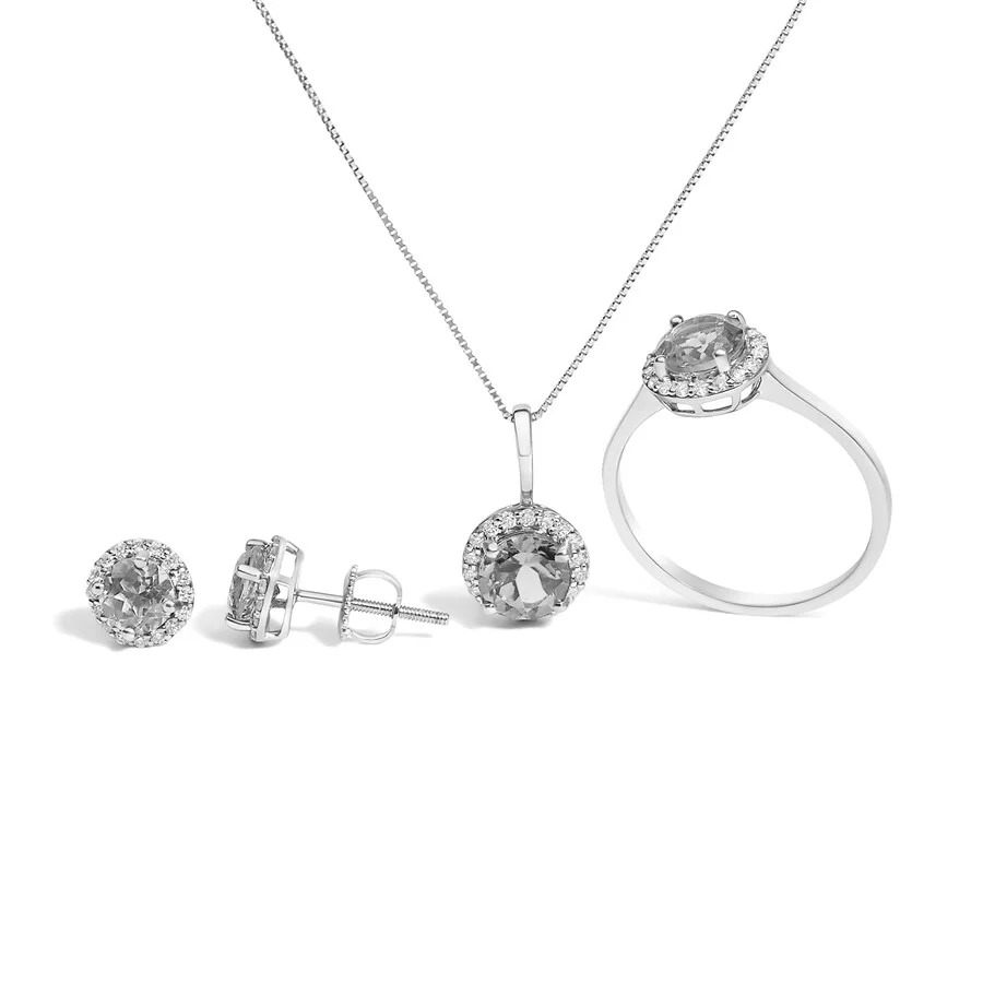 Bathed in the cool touch of 10k white gold, this exquisite three-piece set unites a ring, pendant, and earrings in effortless harmony—delivering a complete, coordinated look. Each piece showcases a vivid round green peridot, heat-treated to enhance its rich hue, and surrounded by a halo of sparkling diamonds (H–I color, VS2–SI1 clarity). The ring features a polished finish with a striking 6x6 mm peridot, while the stud earrings display slightly smaller 5 mm stones in secure four-prong settings with screw-back posts for comfort and peace of mind. The pendant mirrors the ring’s elegance with a 6 mm peridot, suspended from an 18-inch box chain secured by a spring-ring clasp. Designed to be worn together or separately, this set captures timeless beauty and refined craftsmanship. Offering three heirloom-worthy pieces in one, it makes an unforgettable gift and a versatile addition to any collection. Ring size 6.5 GENERAL Stone Shape: Round Color: White Collection Name: Halo Jewelry Set INFORMATION Brand: Haus Of Brilliance Series: Halo Jewelry Set Gender: Womens Model: 024111SS11 DETAILS Size Info: 18 inches Necklaces: Bridal Sets Ring Style: Fashion Chain Type: Box Closure Type: Spring Ring Material : Gold Metal Stamp: 10K Metal Weight: 1.251 Stone Type: Diamond Stone Weight: 0.38 Stone Color: H-I Stone Cut: Round Stone Clarity: VS2 Stone Origin: Natural Total Stones: 72 ADDITIONAL INFO Jomashop Sku: Y-A5MJ6 Department: Jewelry Category: Set