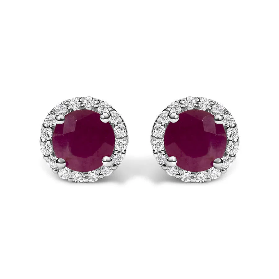 Immerse yourself in the allure of these exquisite 10K white gold stud earrings, each centered with a captivating 5mm natural red ruby, treated to deepen its allure. This gemstone, embraced by four secure prongs, glows with an inner fire enhanced by the radiant halo of meticulously set natural diamonds around it. These diamonds, boasting an H-I color and VS2-SI1 clarity, sparkle with unmatched brilliance, reflecting both light and luxury. Crafted with precision, these earrings feature screw-on backs for added security, ensuring they stay an impeccable adornment through continuous wear. Whether as a gift or a personal treasure, their timeless elegance promises to be a cherished addition to any collection. GENERAL Stone Shape: Round Color: White INFORMATION Brand: Haus Of Brilliance Gender: Womens Model: 024066ES11 DETAILS Earring Style: Stud Ring Style: Fashion Material : Gold Metal Stamp: 10K Metal Weight: 1.161 Stone Type: Diamond Stone Color: H-I Stone Cut: Round Stone Clarity: VS2 Stone Origin: Natural Total Stones: 34 ADDITIONAL INFO Jomashop Sku: Y-A5M3Y Department: Jewelry Category: Earrings